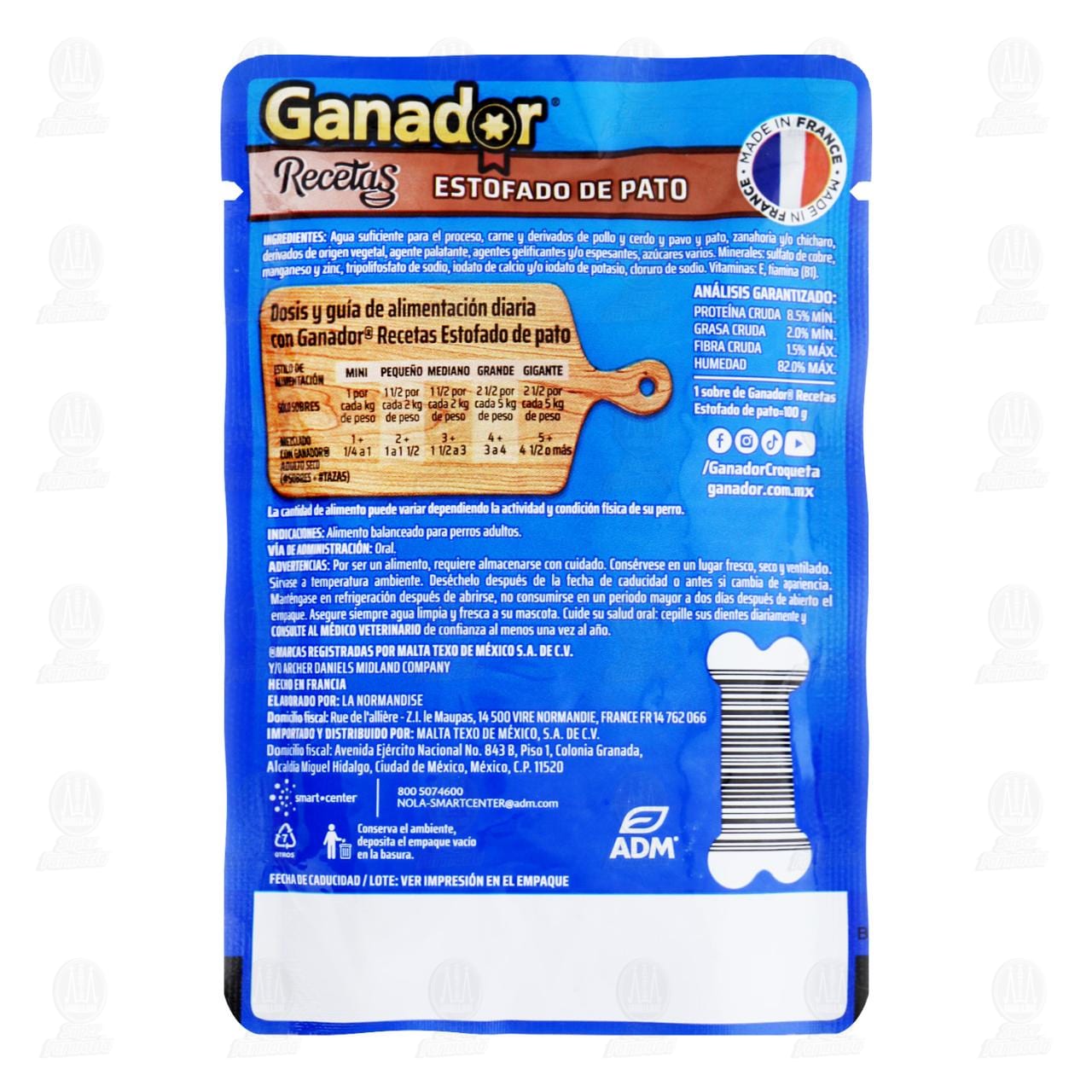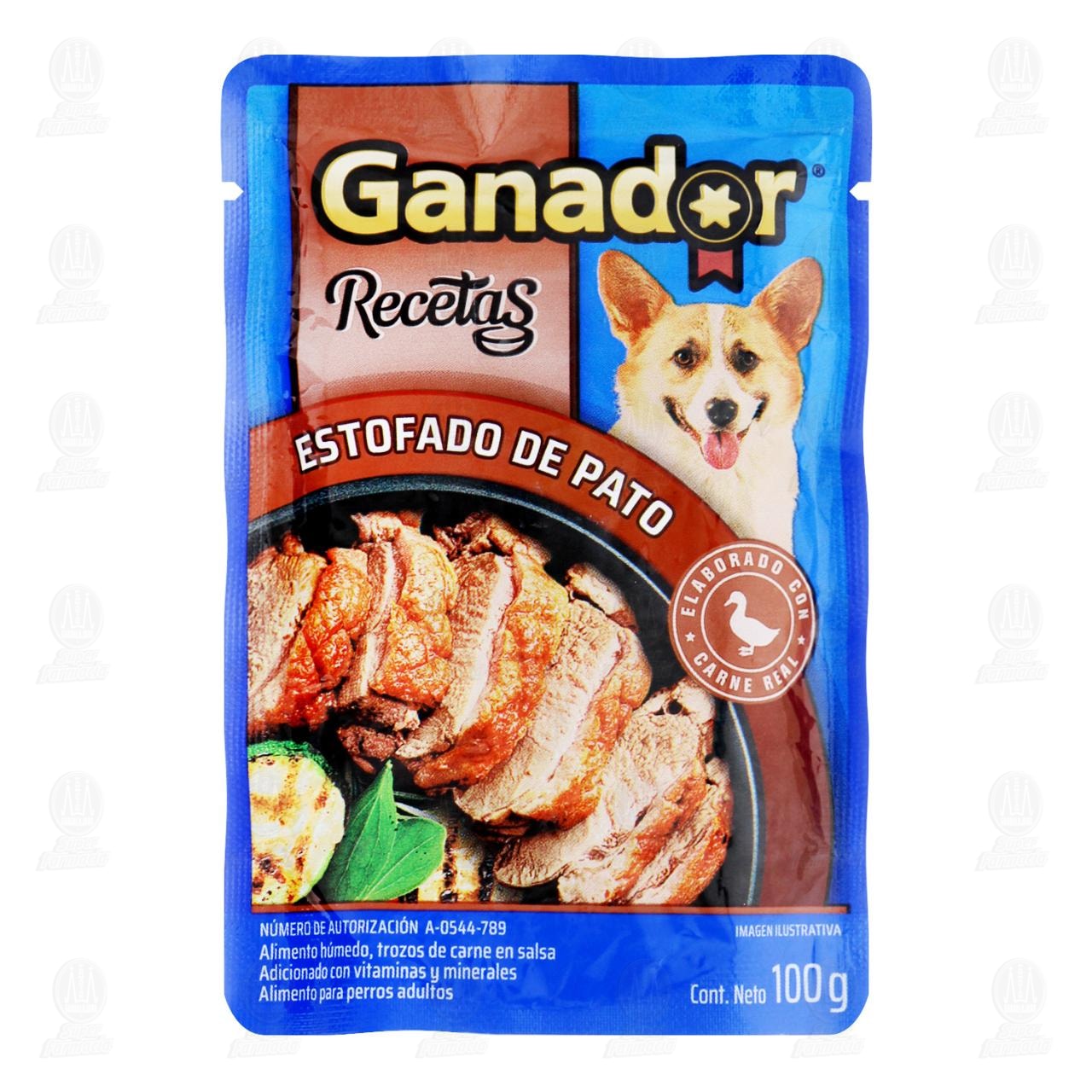 Alimento húmedo Estofado de Pato Ganador Recetas para perros adultos con trozos de carne en salsa, adicionado con vitaminas y minerales. Contiene 100 gramos.