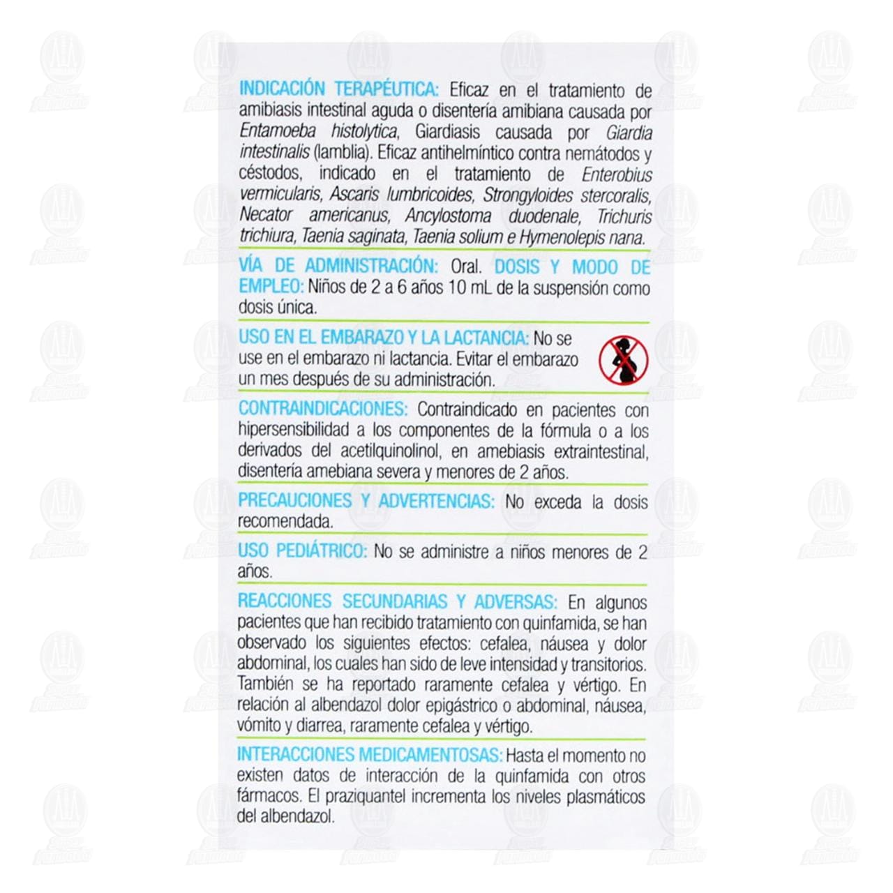 Vía de administración: Oral. Dosis y modo de empleo: Niños de 2 a 6 años 10 ml de la suspensión como dosis única.Detalles del producto
