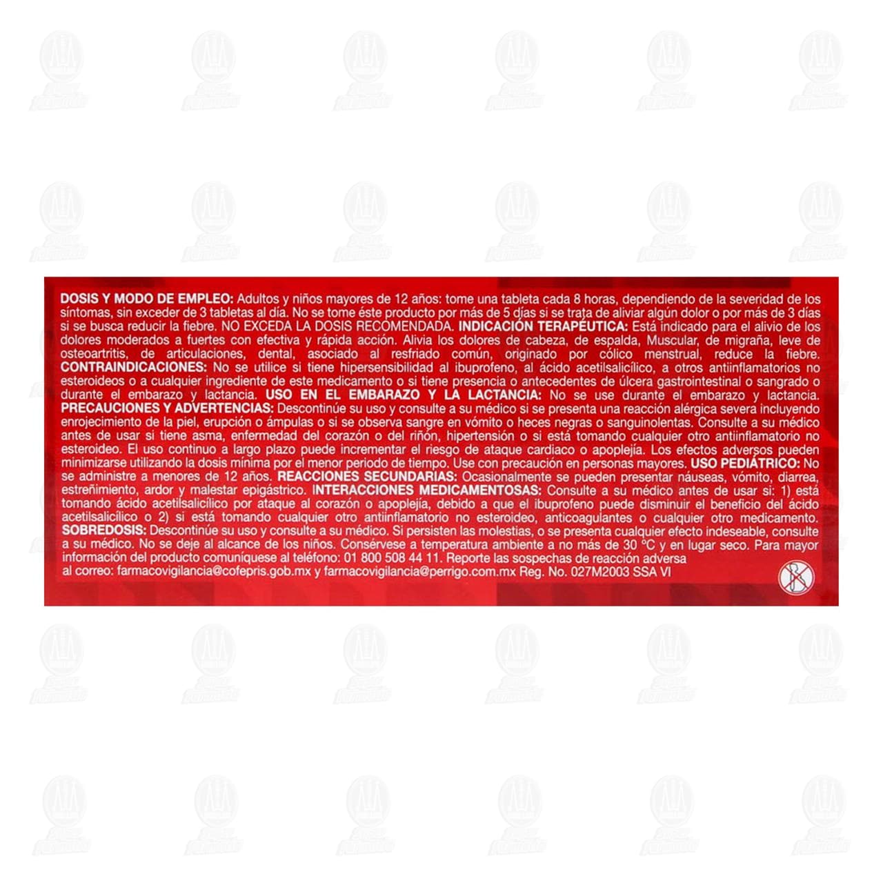 Vía de administración: Oral. Dosis y modo de empleo: Adultos y niños mayores de 12 años: Tome una tableta cada 8 horas, dependiendo de la severidad de los síntomas, sin exceder de 3 tabletas al día. No se tome éste producto por más de 5 días si se trata de aliviar algún dolor o por más de 3 días si se busca reducir la fiebre. No exceda la dosis recomendada. Indicación terapéutica: Esta indicado para el alivio de los dolores moderados a fuertes con efectiva y rápida acción. Alivia dolores de cabeza, de espalda, muscular, de migraña, leve de osteoartritis de articulaciones, dental, asociado al resfriado común, originado por cólico menstrual, reduce la fiebre.Detalles del producto
