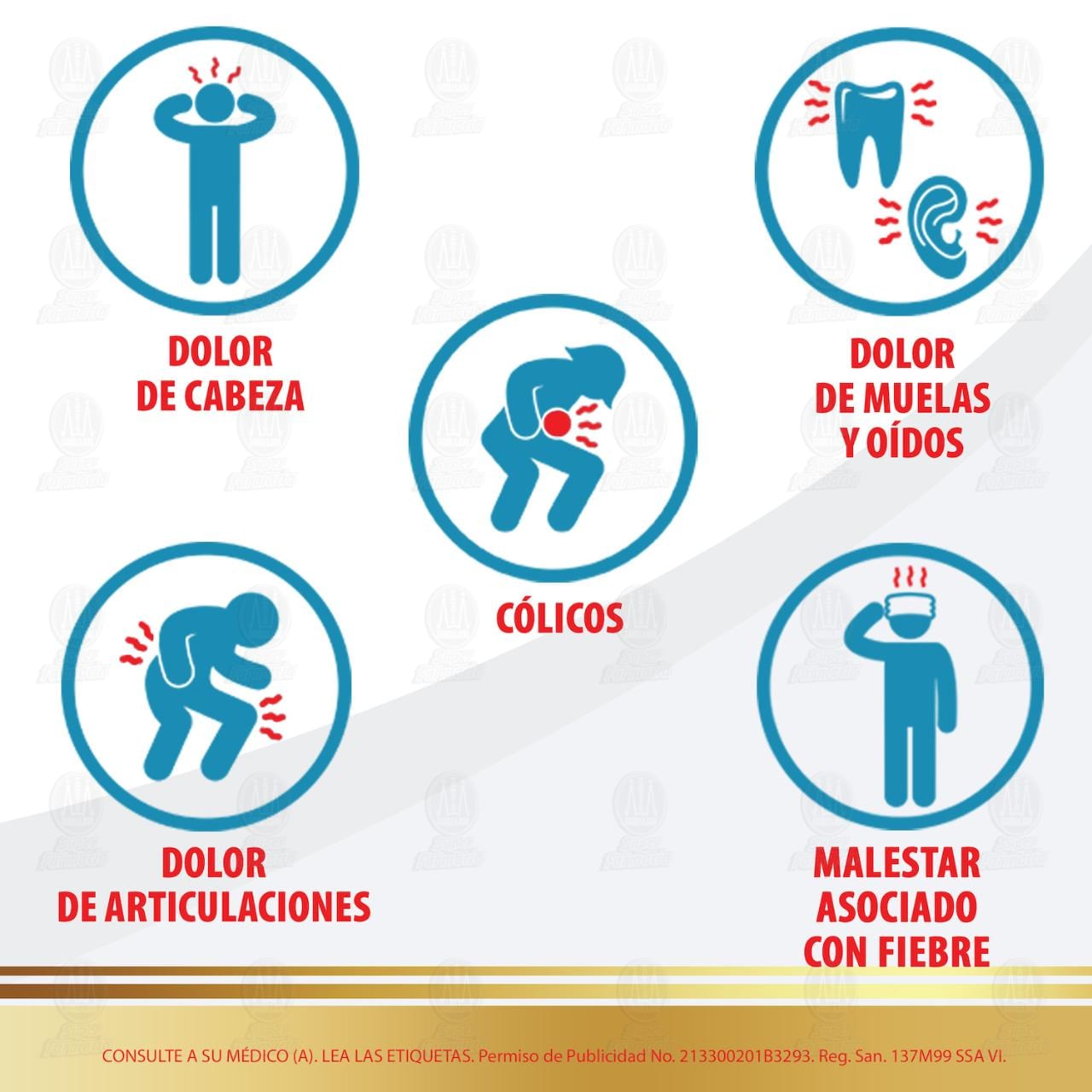 Para el alivio del dolor temporal de cabeza leve a moderado que ocasiona el estrés cotidiano, dolor de articulaciones, malestares asociados con fiebre y dolor, síntomas del resfriado común, dolor de muelas, oídos y cólico menstrual. Oral. Adultos y mayores de 12 años: 1 o 2 tabletas cada 6 horas, sin exceder de ocho tabletas al día. Por un periodo máximo de 5 días.Detalles del producto