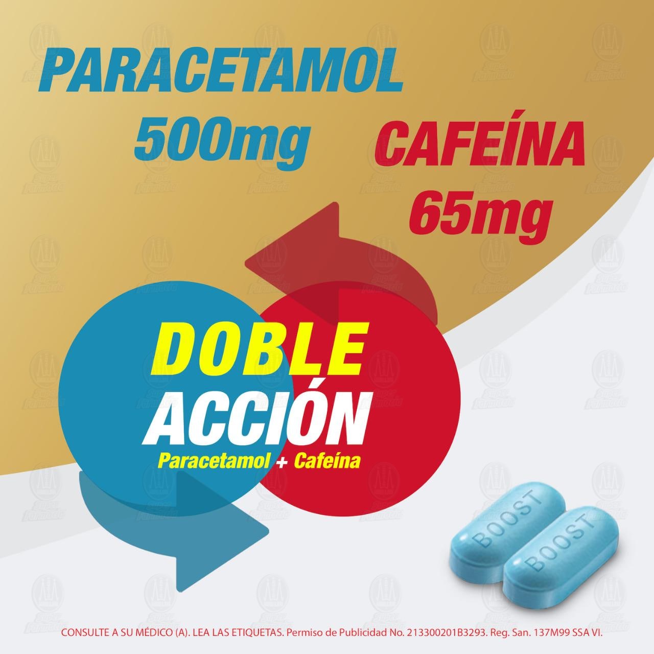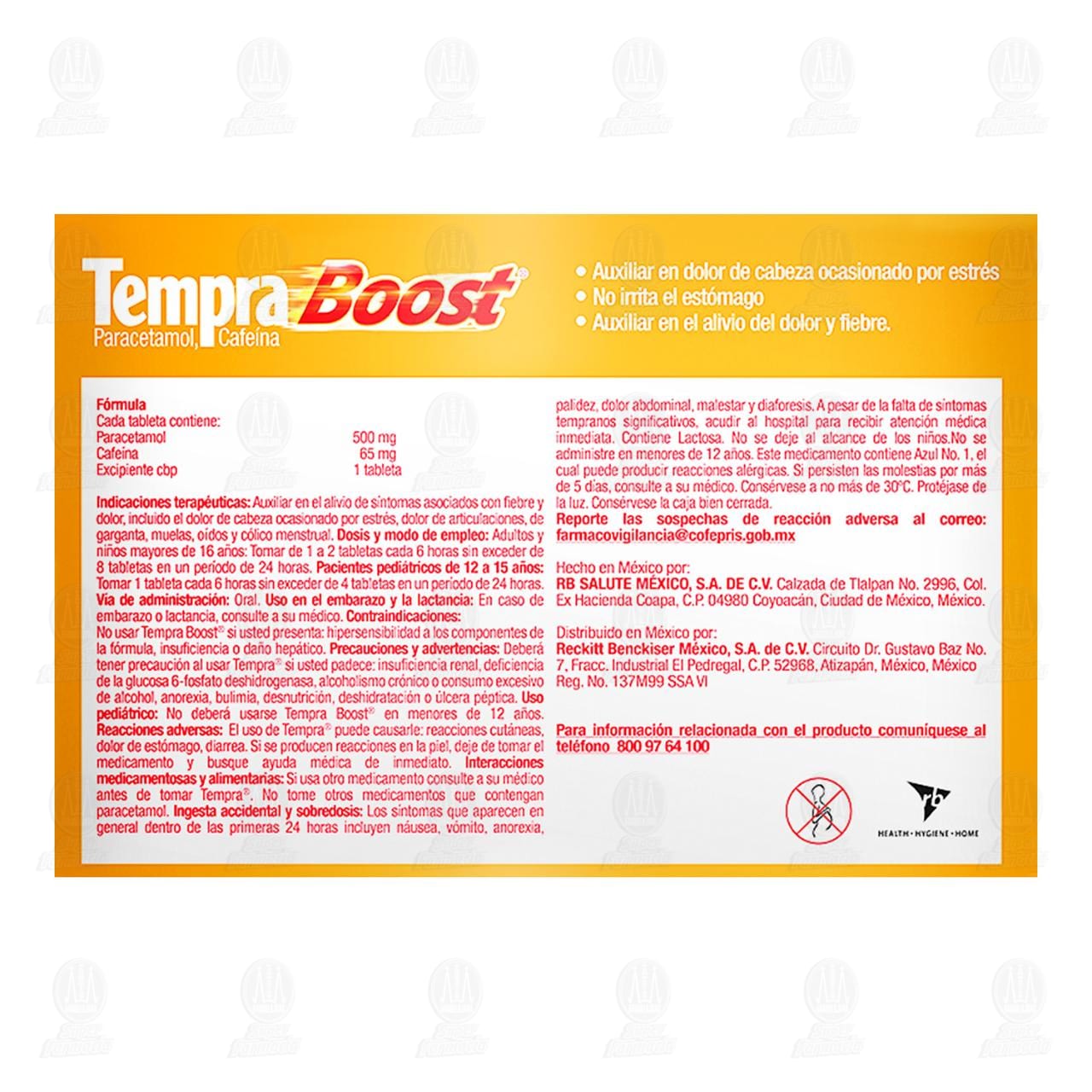 Tempra Boost con 12 tabletas es un analgésico con paracetamol y cafeína, auxiliar para el alivio del dolor temporal de cabeza (leve a moderado), dolor de articulaciones, dolor de muelas, oídos y cólico menstrual (Paracetamol, Cafeína)