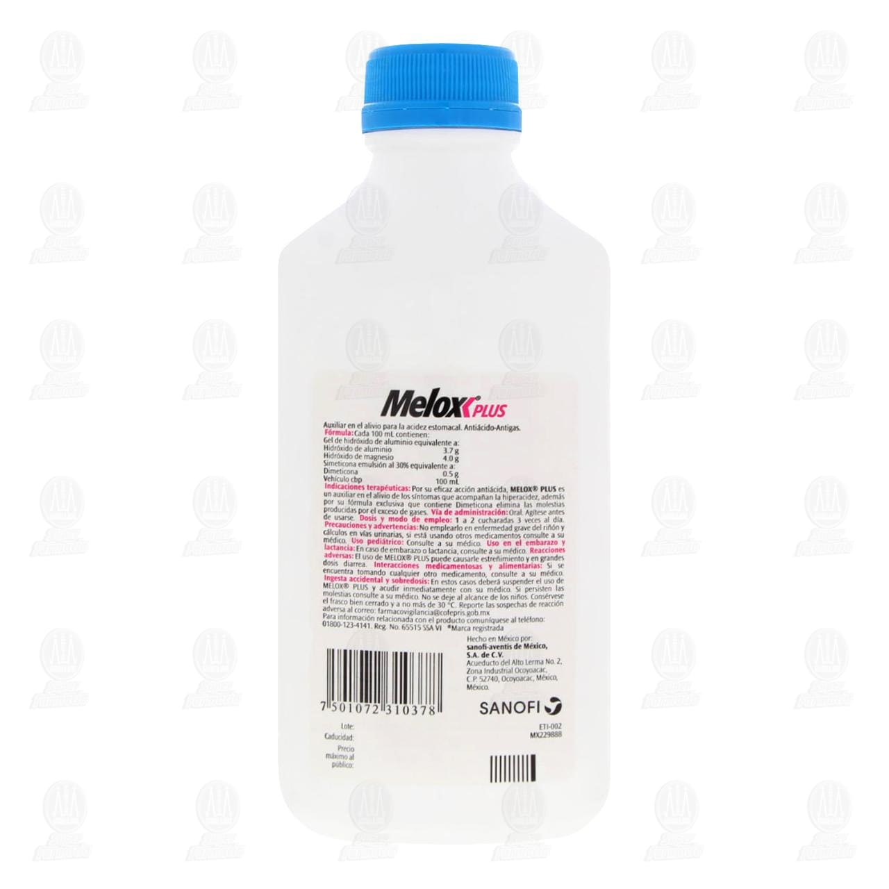 Por su eficaz acción antiácida, Melox Plus es auxiliar en el alivio de síntomas que acompañan la hiperacidez, además su fórmula exclusiva elimina las molestias producidas por el exceso de gases (Hidróxido de aluminio, Magnesio, Dimeticona)