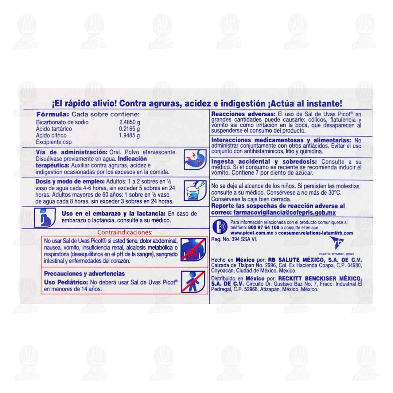 Sal de Uvas Picot con 10 sobres, es un polvo antiácido efervescente, que alivia agruras, acidez e indigestión. El rápido alivio para las molestias por comer en exceso (Bicarbonato de sodio, Ácido tartárico, Ácido cítrico)