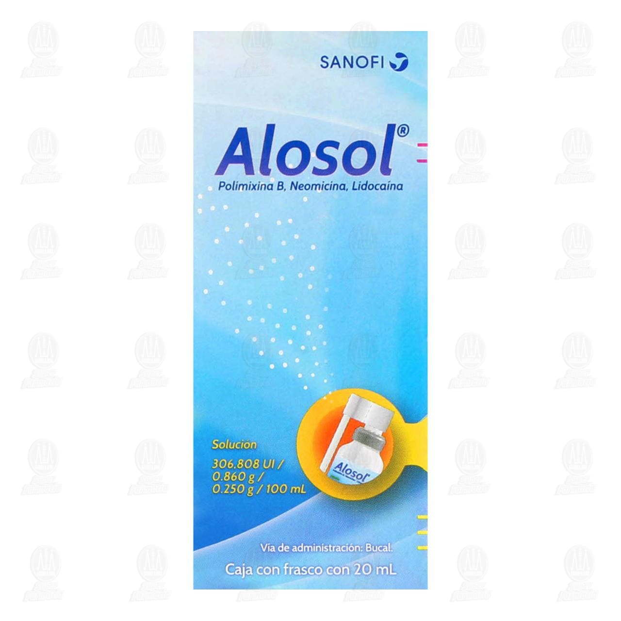 FARMACOCINÉTICA Y FARMACODINAMIA: ALOSOL® combina la acción bactericida de dos antibióticos que ejercen su efecto en los procesos infecciosos de origen bacteriano, con un anestésico local. La neomicina es un antibiótico aminoglucósido, activo contra una extensa variedad de patógenos bacterianos grampositivos y gramnegativos, que inhibe la síntesis de las proteínas al unirse a la unidad ribosomal 30S de la bacteria. La polimixina B es un antibiótico bactericida que actúa sobre una gran cantidad de gérmenes grampositivos y gramnegativos, alterando la permeabilidad de la membrana citoplásmica bacteriana. Las propiedades anestésicas de la lidocaína ayudan a reducir considerablemente las molestias de las afecciones bucofaríngeas. A diferencia de los derivados del ácido para-aminobenzoico, la lidocaína carece de efectos alergénicos.