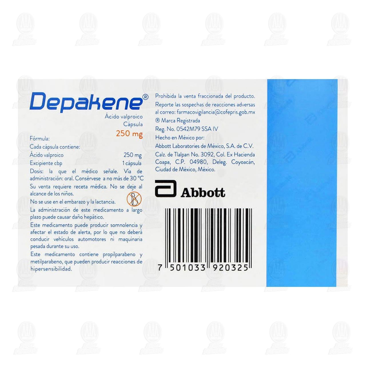 PRESENTACIONES: DEPAKENE® (ácido valproico) se presenta en caja con 30 y 60 cápsulas con 250 mg de ácido valproico en envase de burbuja.