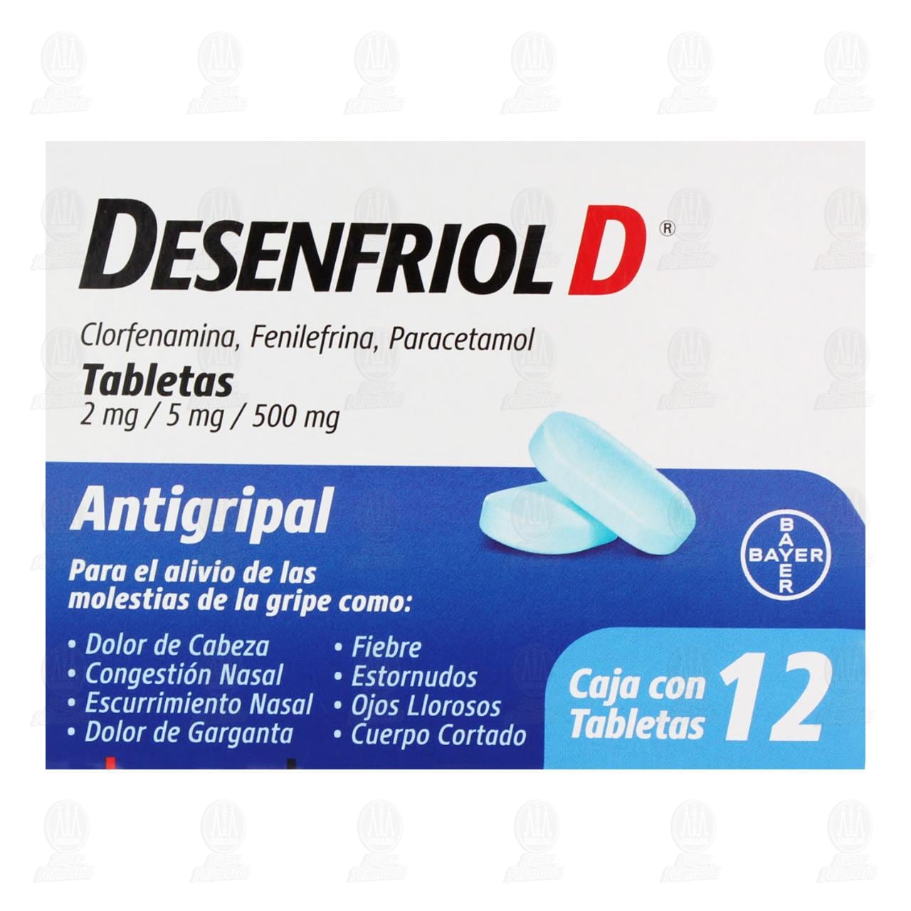 Desenfriol-D ayuda a aliviar los molestos síntomas del resfriado y la gripa que no te permiten disfrutar las cosas buenas de la vida. Su fórmula cuenta con 500 mg de paracetamol, que ayuda a aliviar los malestares comunes asociados al resfriado. Reduce la intensidad del dolor de cabeza para unirte a la diversión familiar; controla la fiebre que puede arruinar tu noche; alivia la congestión nasal para que respires con libertad; reduce los estornudos para que disfrutes de una película sin agregar efectos de sonido; combate el escurrimiento nasal y despídete del pañuelo; elimina la molestia de los ojos llorosos; ayuda a que la garganta irritada se sienta más cómoda y lista para cantar; elimina el cuerpo cortado para que puedas correr, saltar y jugar sin preocupaciones. Con más de 50 años en el mercado Desenfriol es reconocida como una marca de tradición que ayuda a aliviar los síntomas del resfriado común de grandes y pequeños. Los años de experiencia de Bayer como creador de productos para aliviar los síntomas del resfriado y la gripa garantizan la calidad de Desenfriol-D Adultos y niños mayores a 12 años: 2 tabletas cada 6 a 8 horas (2 tabletas 3 ó 4 veces al día). No más de 8 tabletas en 24 horas no usar durante más de 5 días continuos.Detalles del producto