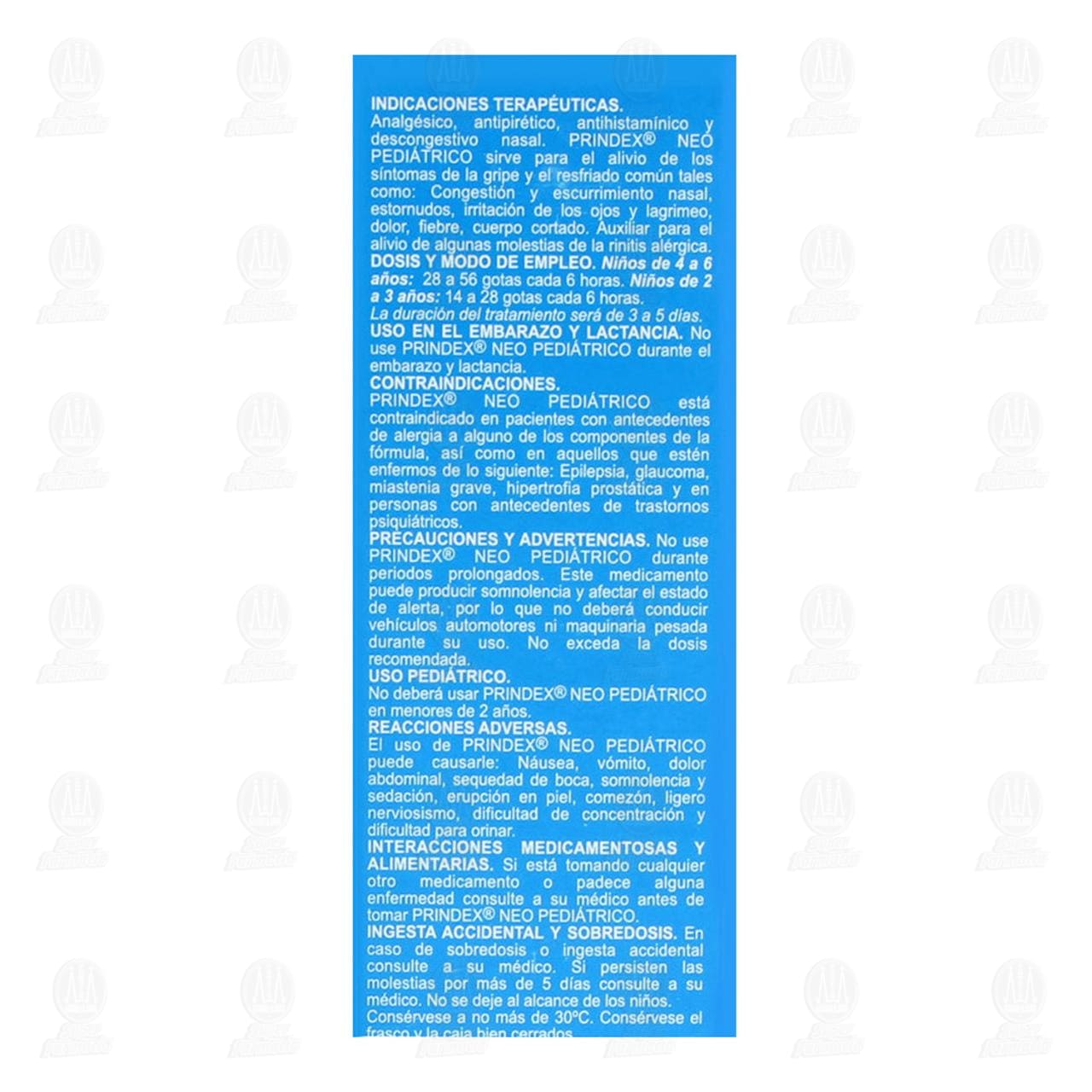 CONTRAINDICACIONES: PRINDEX® NEO PEDIÁTRICO está contraindicado en pacientes con antecedentes de alergia a alguno de los componentes de la fórmula, así como en aquellos que estén enfermos de lo siguiente: epilepsia, glaucoma, miastenia grave, hipertrofia prostática y en personas con antecedentes de trastornos psiquiátricos.