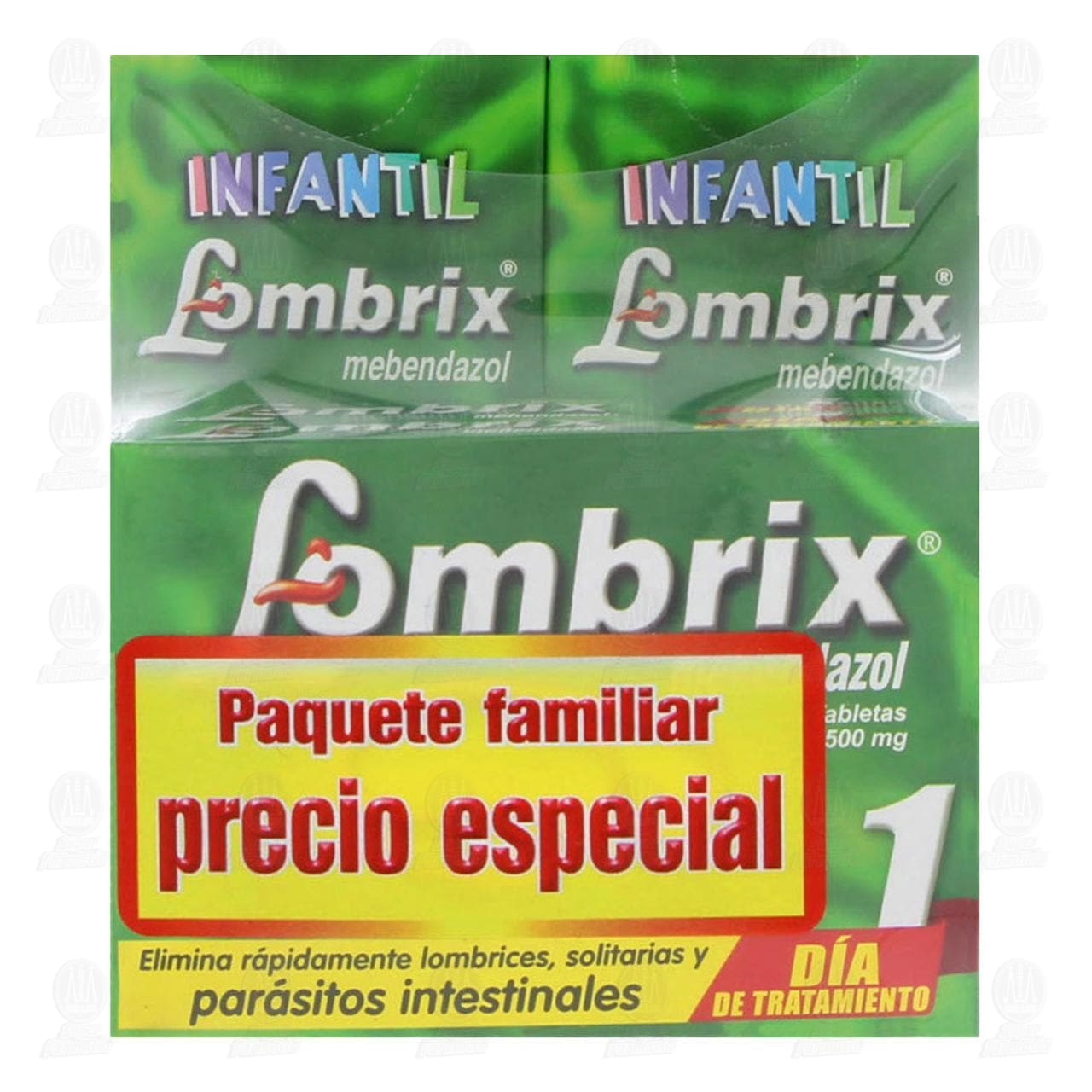 Pack Lombrix Paquete Familiar 1 Sola toma elimina parásitos intestinales como lombrices , solitarias, oxiuros,áscaris, tricocéfalos. Contiene 4 piezas: 2 Frascos de Lombrix Infantil en suspensión más 2 Cajas de Lombrix con 1 Tableta cada una (Mebendazol)