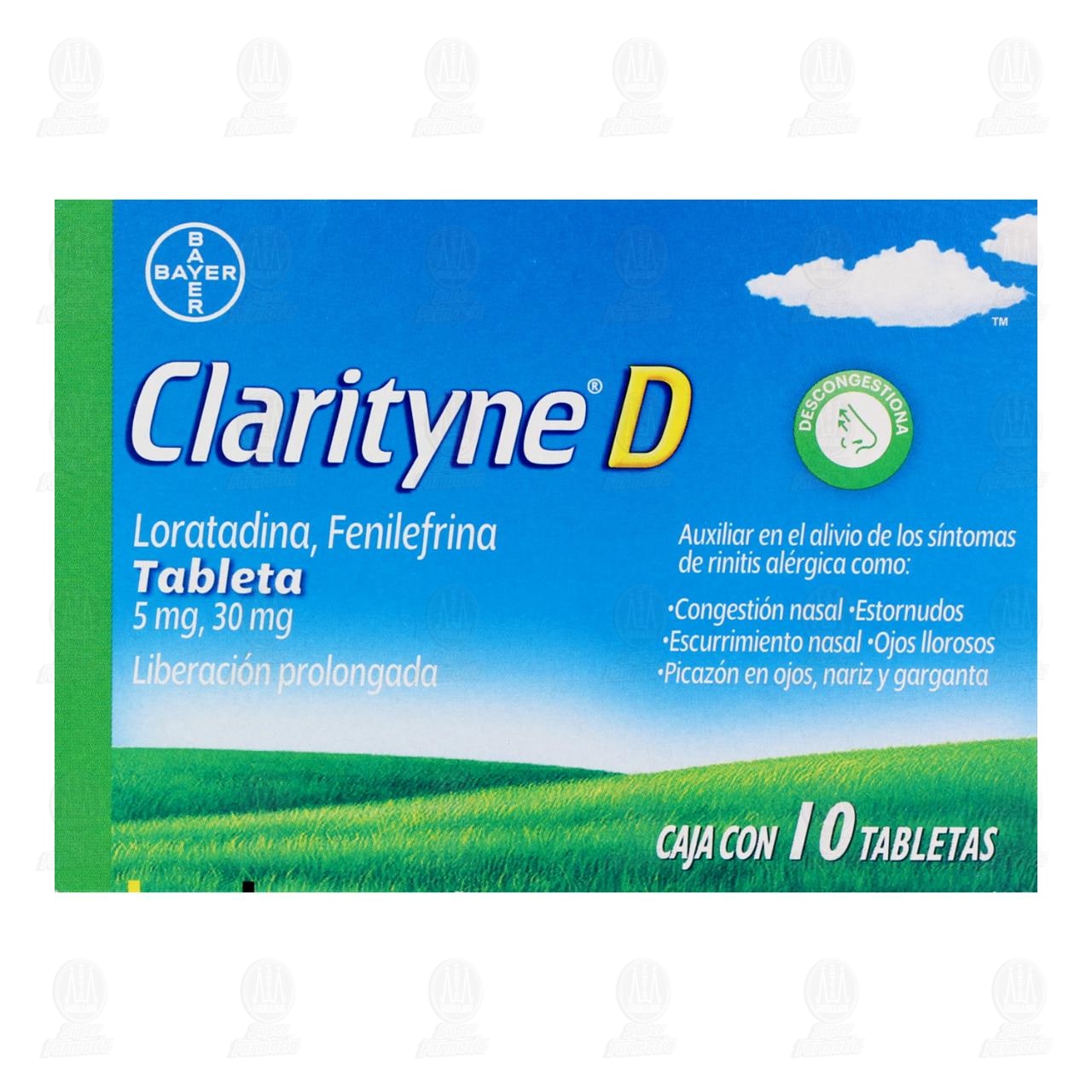 Clarityne-D Tabletas alivia síntomas de rinitis o dermatitis alérgica: congestión nasal, estornudos, ojos llorosos, picazón de nariz o garganta, urticaria o hinchazón. Acción antialérgica dentro de 30 minutos (Loratadina, Fenilefrina)