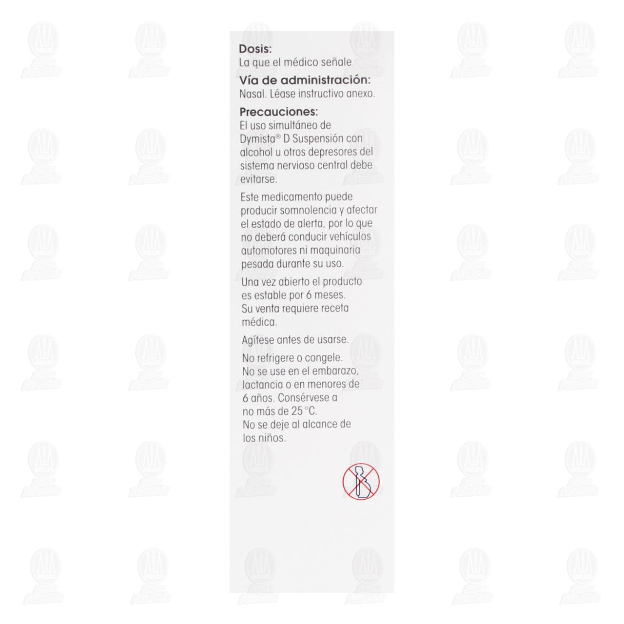 Evitar la aplicación de DYMISTA® D Suspensión en los ojos. Su venta requiere receta médica. No se deje al alcance de los niños. No se use en el embarazo, lactancia o en menores de 12 años. Consérvese a temperatura ambiente a no más de 30°C.