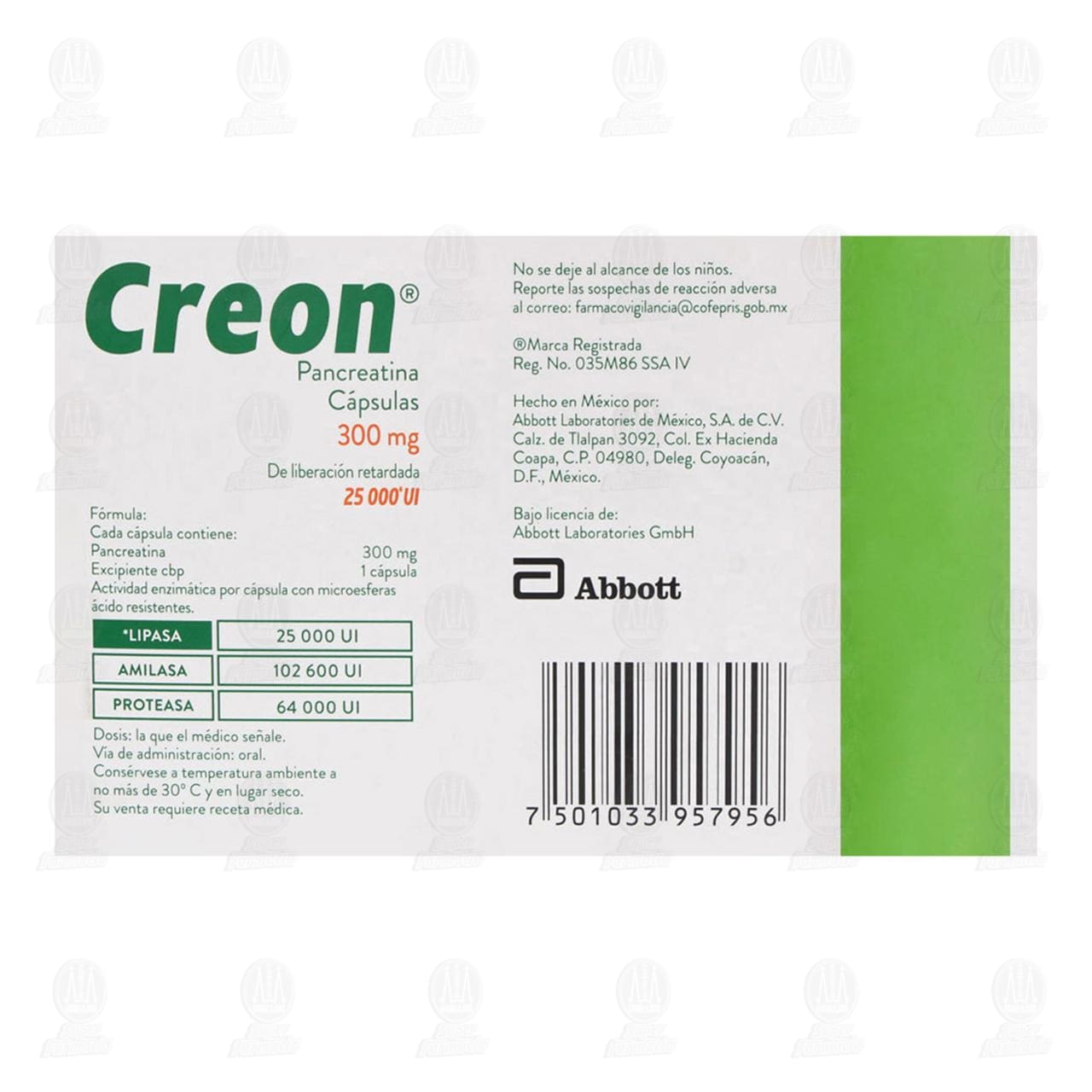 Al igual que todos los productos comercializados actualmente que contienen enzimas pancreáticas, CREON® es fabricado a partir de tejido de páncreas de porcinos criados para consumo humano. Aunque el riesgo de que CREON® pueda transmitir algún agente infeccioso a los humanos ha sido reducido mediante pruebas y la inactivación de ciertos virus durante el proceso de fabricación, existe un riesgo teórico de transmisión de enfermedades virales, incluyendo las enfermedades causadas por virus nuevos o no identificados. Hasta el momento no se han reportado casos de transmisión de una enfermedad infecciosa asociada con el uso de enzimas de extracto pancreático porcino, aun cuando han sido usadas por periodos prolongados.