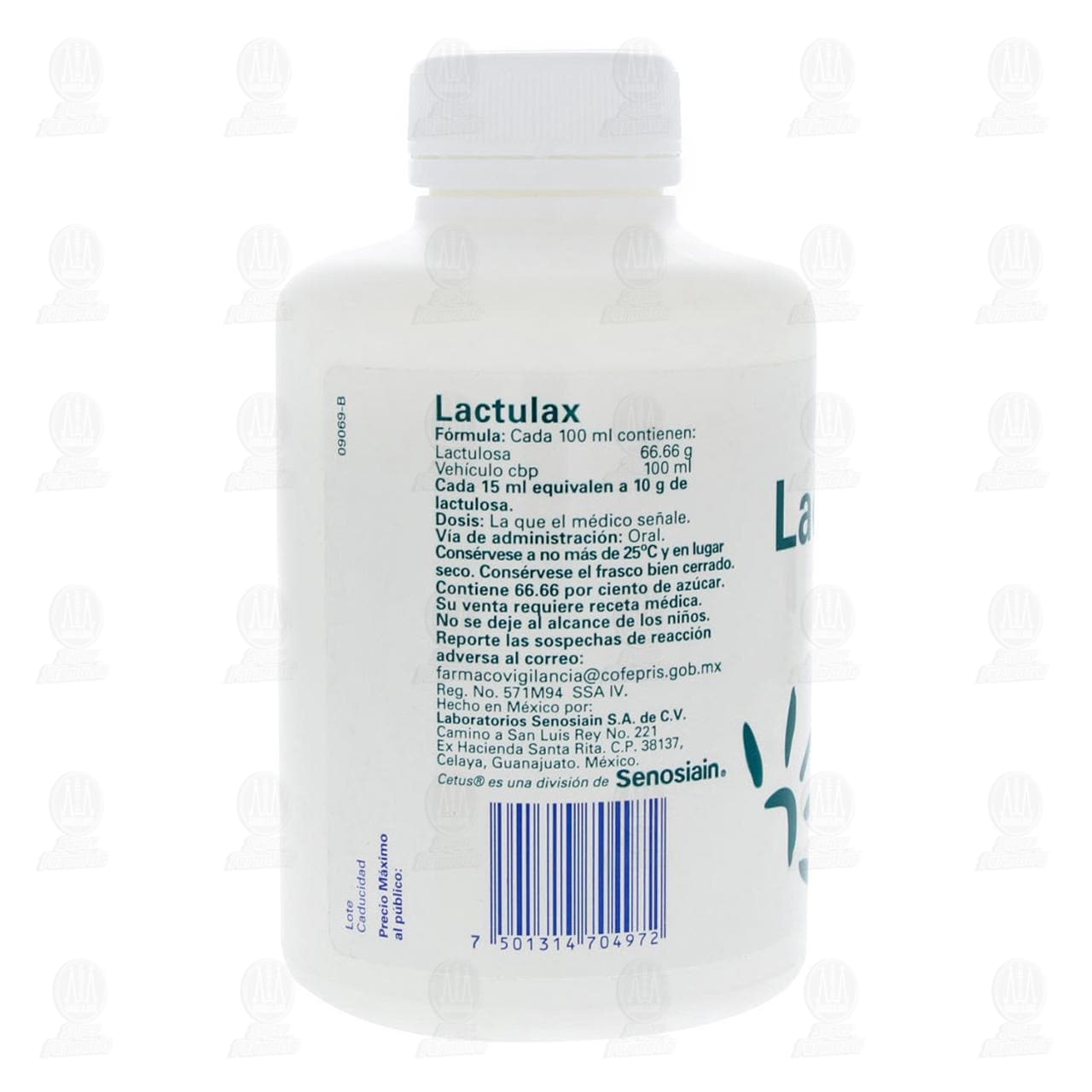 PRECAUCIONES GENERALES: LACTULAX contiene galactosa (menos de 2.2 g/15 ml), y lactosa (menos de 1.2 g/15 ml), por lo que debe ser usado con precaución en pacientes diabéticos.