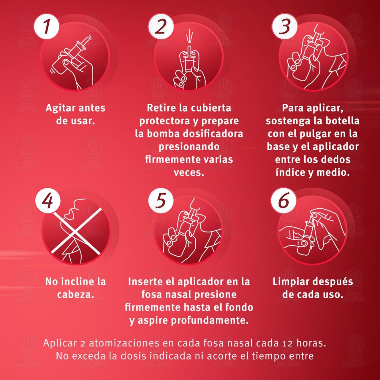 Adultos y niños mayores de 10 años: 2 atomizaciones en cada fosa nasal cada 12 horas. Niños de 6 a 10 años: 1 atomización en cada fosa nasal cada 12 horas. No exceda la dosis recomendada, no suspenda la frecuencia de administración. El uso de este contenedor por más de una persona podría propagar la infección. Si persisten las molestias por más de 3 días, consulte a su médico. Agítese bien antes de utilizarse. Antes de usarlo por primera vez, retire la cubierta protectora de la punta y prepara la bomba dosificadora presionando firmemente la bomba en varias ocasiones. Para aplicar el spray, sostenga la botella con el pulgar en la base y el aplicador entre los dedos índice y medio. Sin inclinar la cabeza, inserte el aplicador en la fosa nasal, presione firmemente hasta el fondo y aspire profundamente. Limpie el aplicador después de cada uso.Detalles del producto