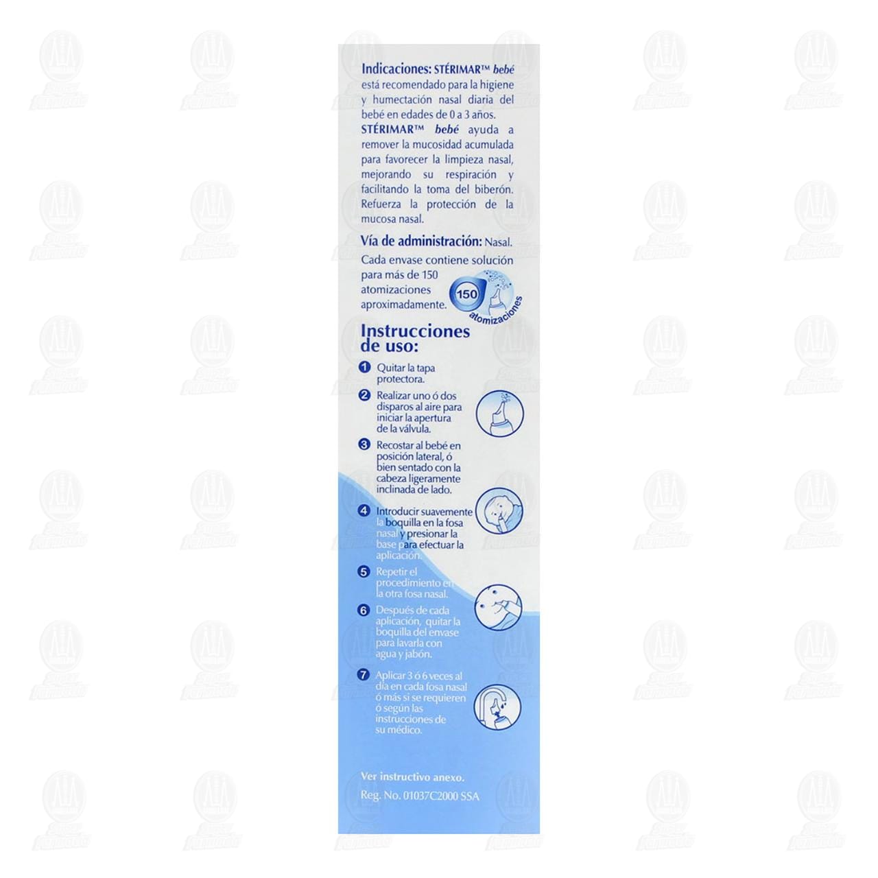 Indicaciones: Stérimar™bebé está recomendado para la higiene y la humectación nasal diaria del bebé en edades de 0 a 3 años. Stérimar bebé ayuda a remover la mucosidad acumulada mejorando su respiración y facilitando la toma del biberón. Refuerza la protección de la mucosa nasal. Vía de administración: nasal. Cada envase contiene solución para más de 150 atomizaciones aproximadamente. 1. quitar la tapa protectora. 2. realizar uno o dos disparos al aire para iniciar la apertura de la válvula. 3. recostar al bebé en posición lateral, ó bien sentado con la cabeza ligeramente inclinada de lado. 4. introducir suavemente la boquilla en la fosa nasal y presionar la base para efectuar la aplicación. 5. repetir el procedimiento en la otra fosa nasal. 6. después de cada aplicación, quitar la boquilla del envase para lavarla con agua y jabón. 7. aplicar ó 6 veces al día en cada fosa nasal ó más si se requieren ó según las instrucciones de su médico.Detalles del producto