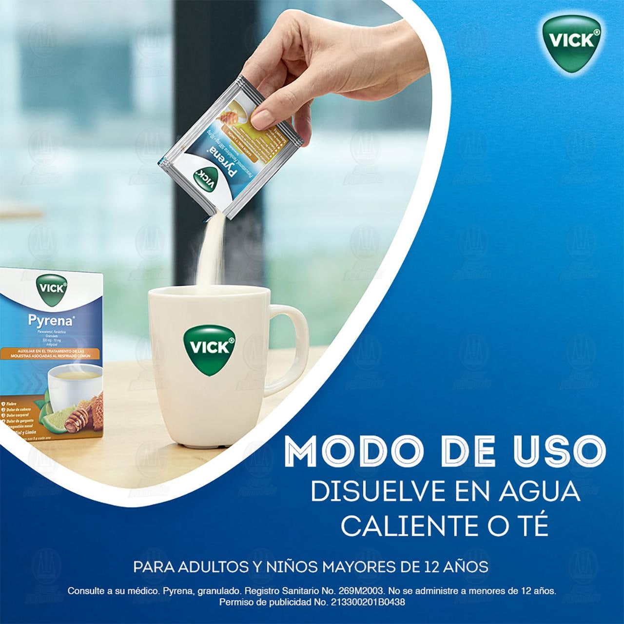 Vick Pyrena es un antigripal que funciona como auxiliar en el tratamiento de las molestias asociadas al resfriado común, como congestión nasal, dolor de cabeza, fiebre, dolor de garganta y dolores corporales (Paracetamol, Fenilefrina)