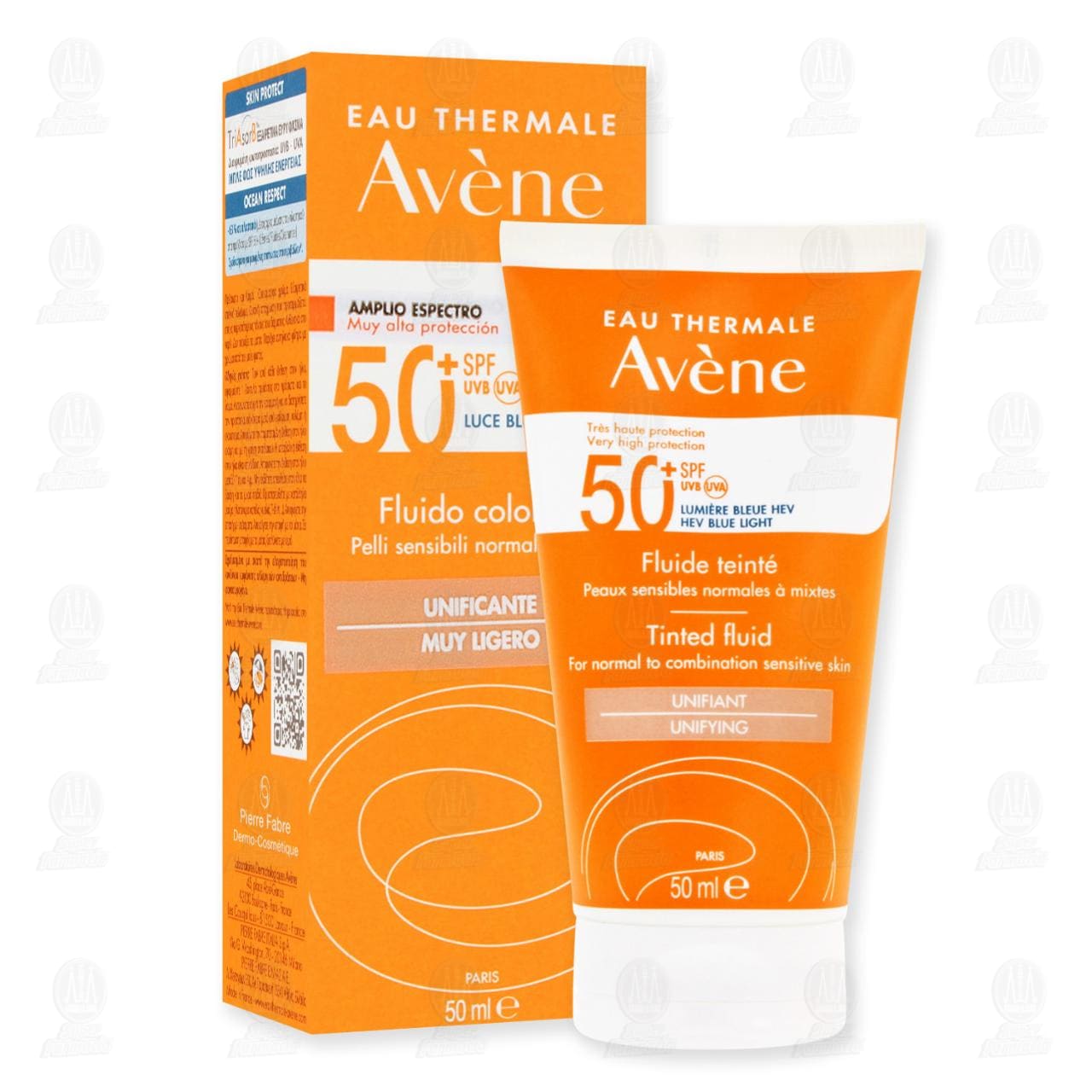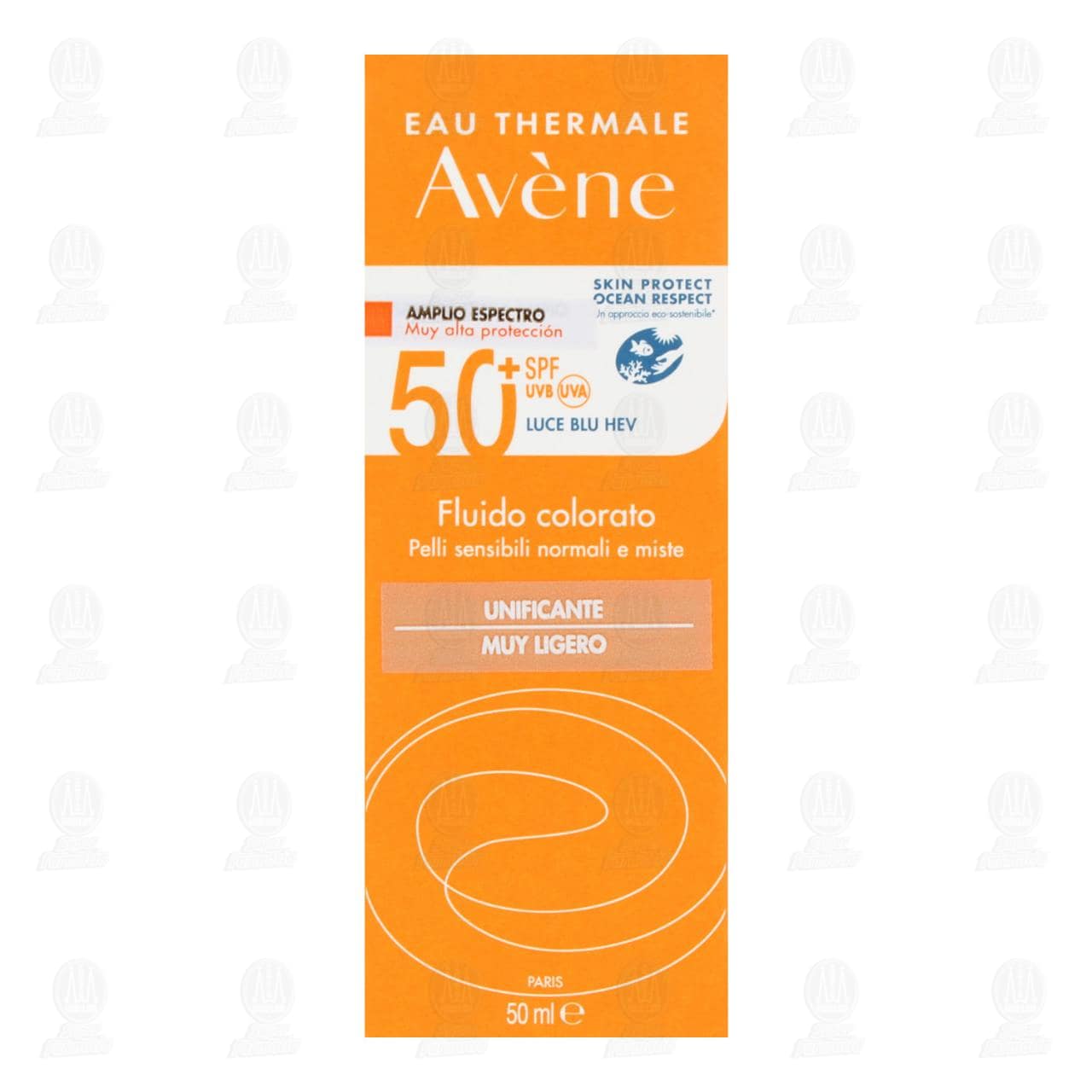Avène Protector Solar FPS 50+ Fluido Toque Seco con Color, Protección UVB, UVA y Luz Visible de Alta Energía, Protección Muy Alta. Para Piel Sensible, Normal Y Mixta. Envase con 50 mililitros.