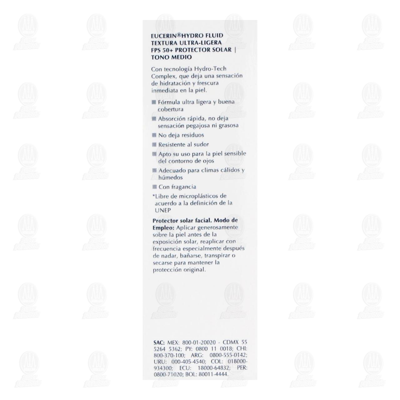 Eucerin Protector Solar Hydro Fluid Textura Ultra-Ligera FPS 50+ efecto mate toque seco con color tono medio para todo tipo de piel con advanced spectral technology, Con pigmentos de color para un tono uniforme. Envase con 50 mililitros.