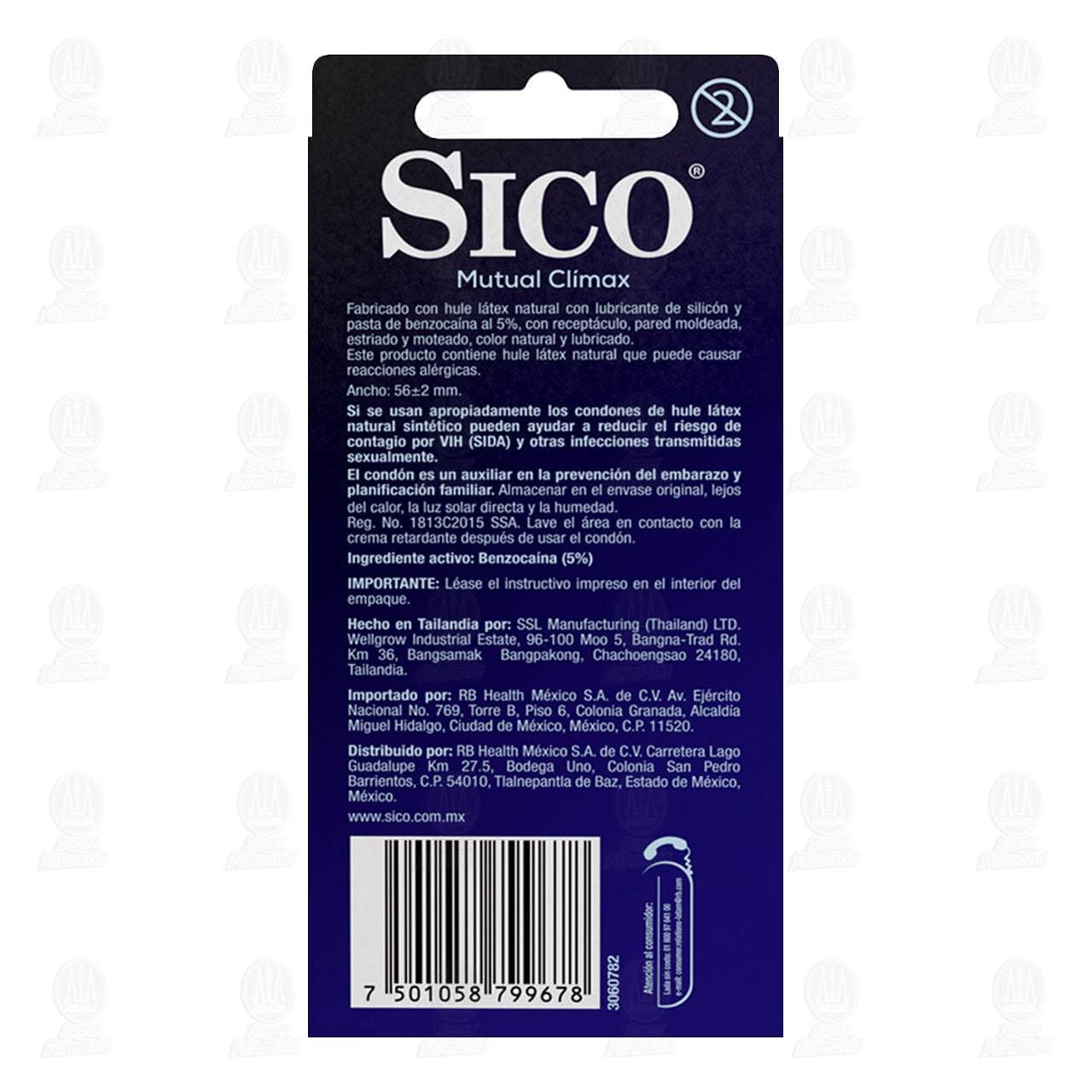 Sico Clímax Mutuo son condones de látex texturizado y con crema a base de benzocaína para retardar el clímax. El uso del condón ayuda en la prevención del embarazo, la planificación familiar y reduce el riesgo de contagio de VIH/SIDA.