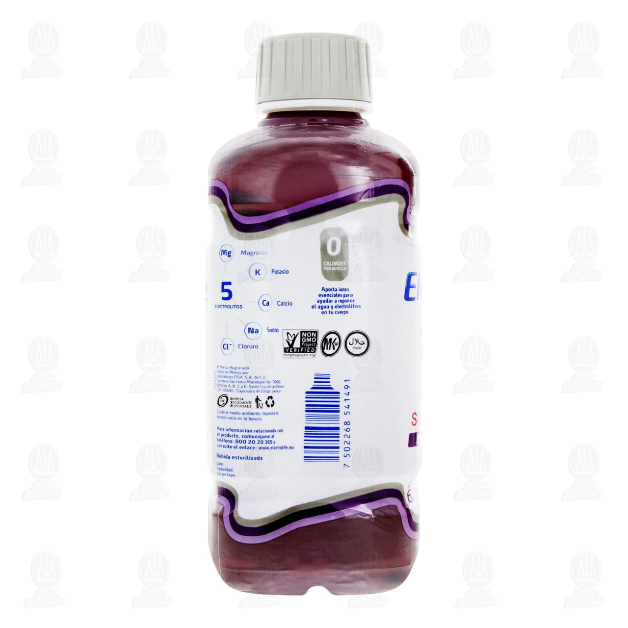Bebida hidratante Electrolife Zero, aporta iones esenciales para ayudar a reponer el agua y electrolitos en tu cuerpo, 0 calorías y 0 azúcar, sin conservadores, sabor uva. Envase con 625 mililitros.