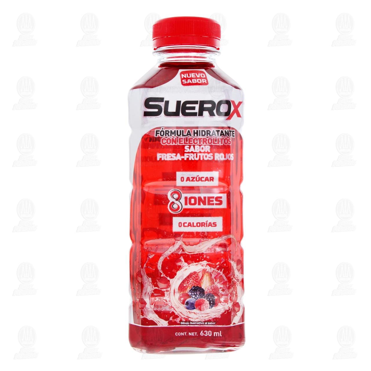 Fórmula Hidratante Suerox con electrolitos sabor fresa-frutos rojos. Envase con 630 mililitros.