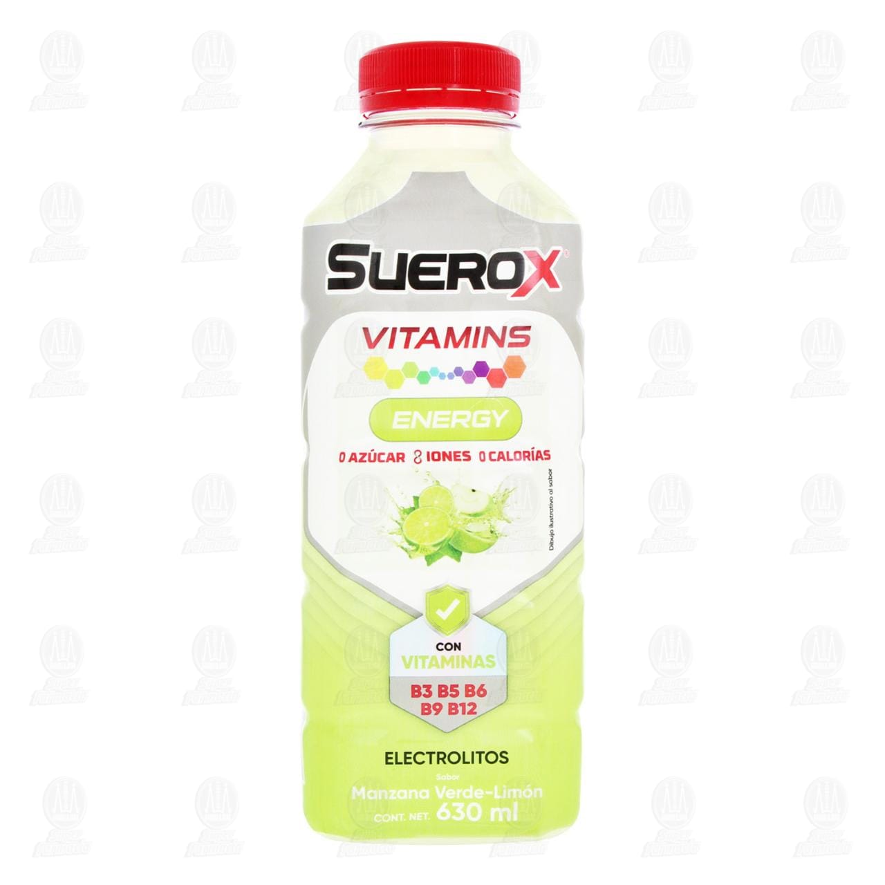 Electrolitos Suerox vitamins defense sabor manzana verde-limón adicionada con vitaminas. Envase con 630 mililitros.