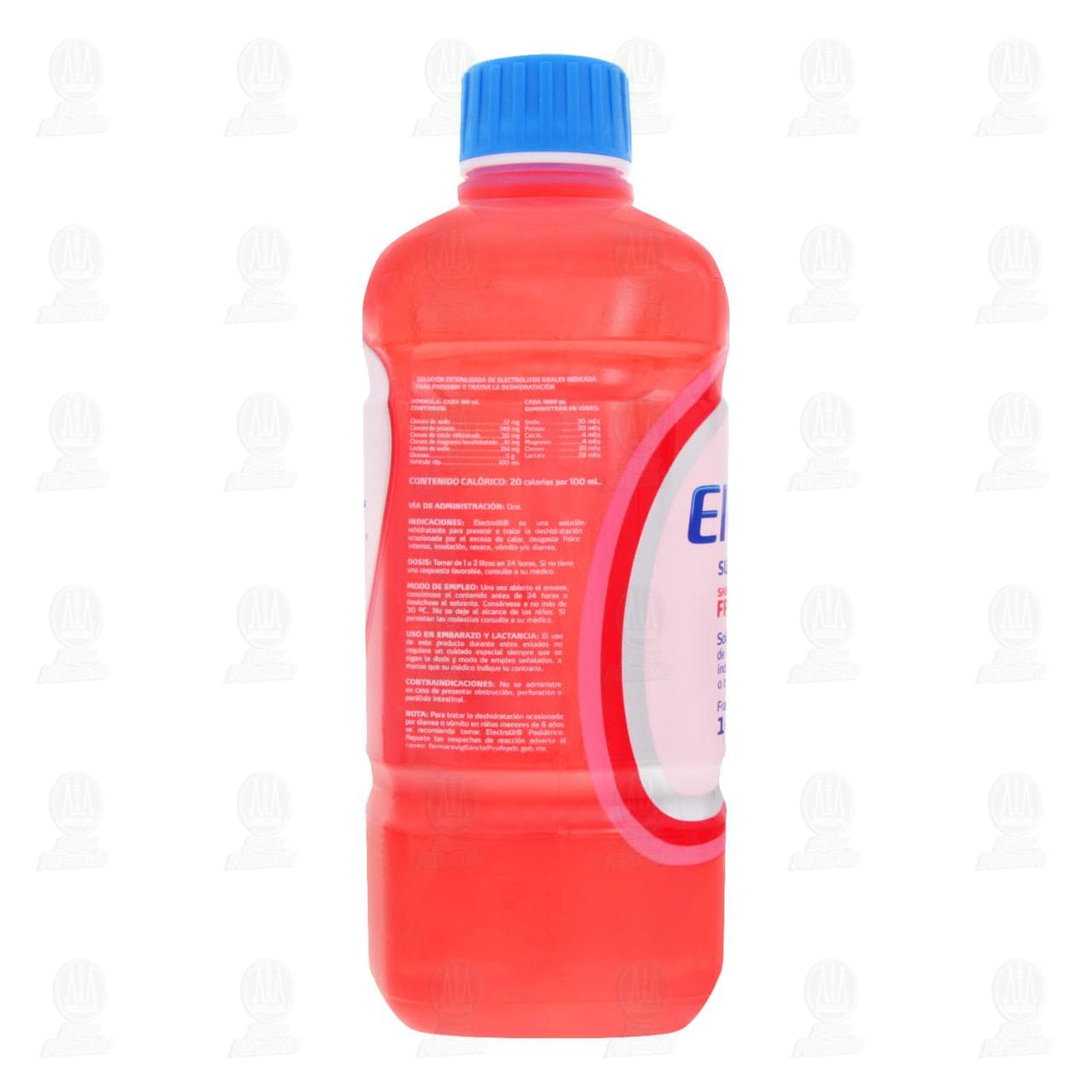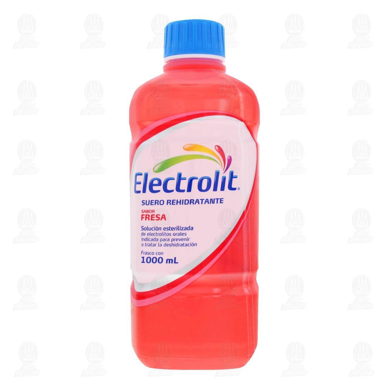 Suero rehidratate Electrolit para prevenir o tratar la deshidratación ocasionada por el exceso de calor, desgaste físico intenso, insolación, resaca, vómito y/o diarrea, sabor fresa. Envase con 1000 mililitros.