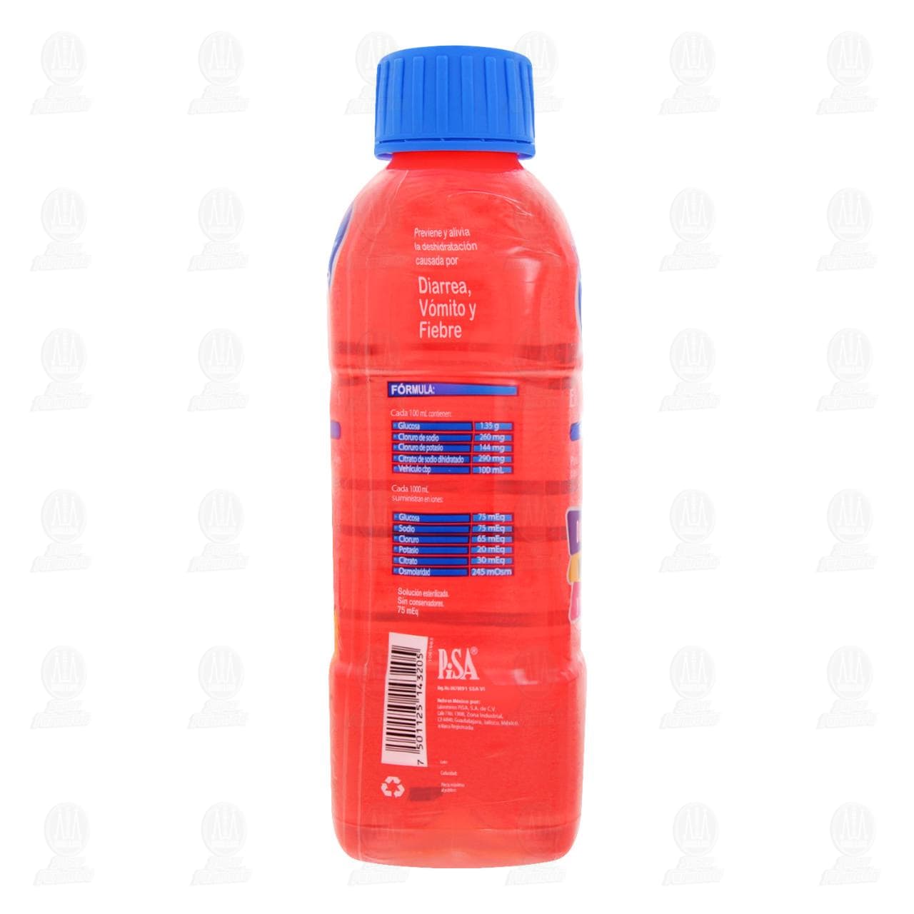 Electrolitos orales Electrolit Pediátrico para recuperar los líquidos y electrolitos perdidos por la diarrea, el vómito o la fiebre, sabor fresa. Envase con 500 mililitros.