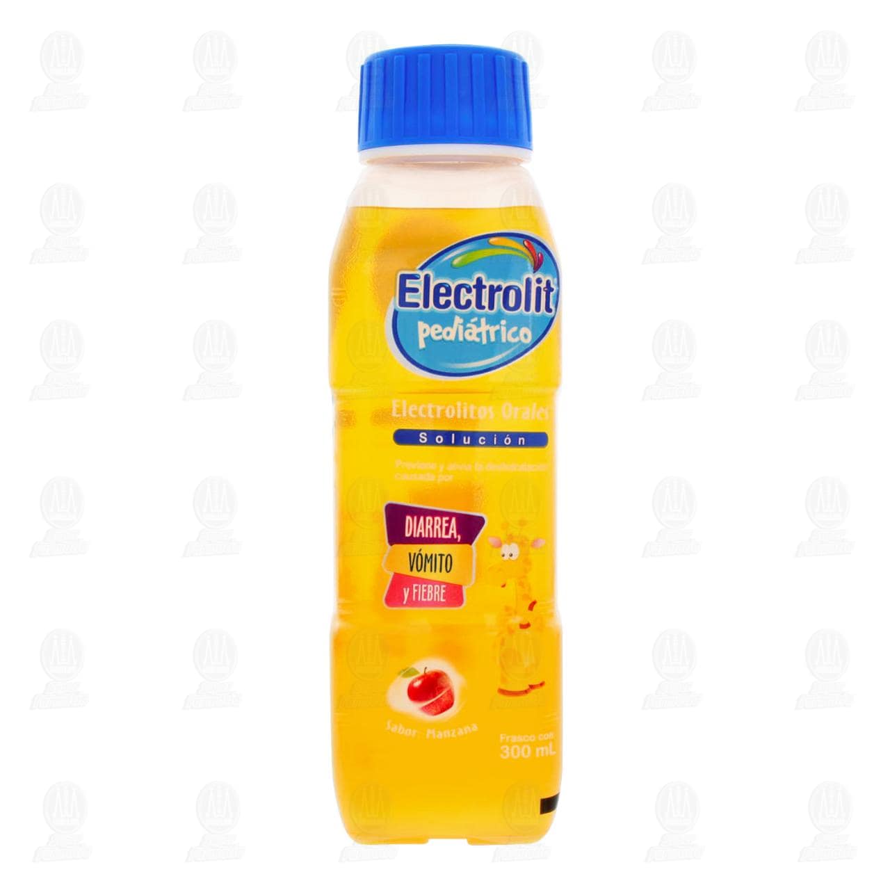Electrolitos orales Electrolit Pediátrico para recuperar los líquidos y electrolitos perdidos por la diarrea, el vómito o la fiebre, sabor manzana. Envase con 300 mililitros.