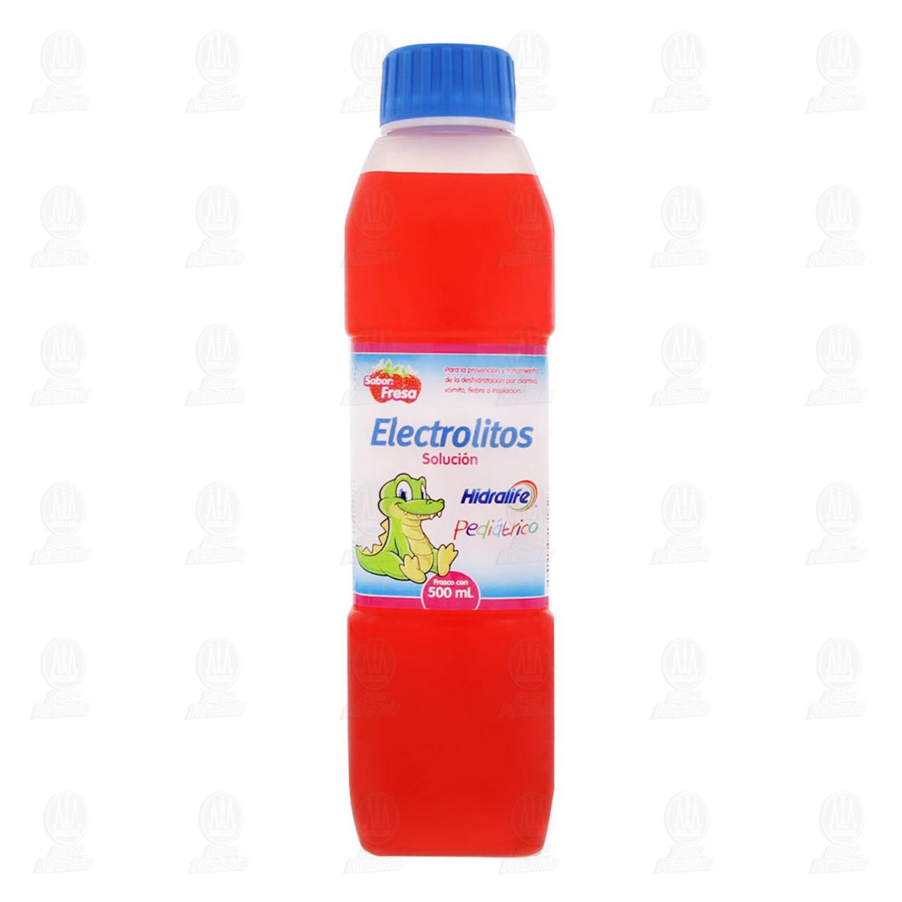 Electrolitos orales Hidralife Pediátrico esterilizado para la prevención y tratamiento de la deshidratación por diarrea, vómito, fiebre o insolación, sabor fresa. Envase con 500 mililitros.