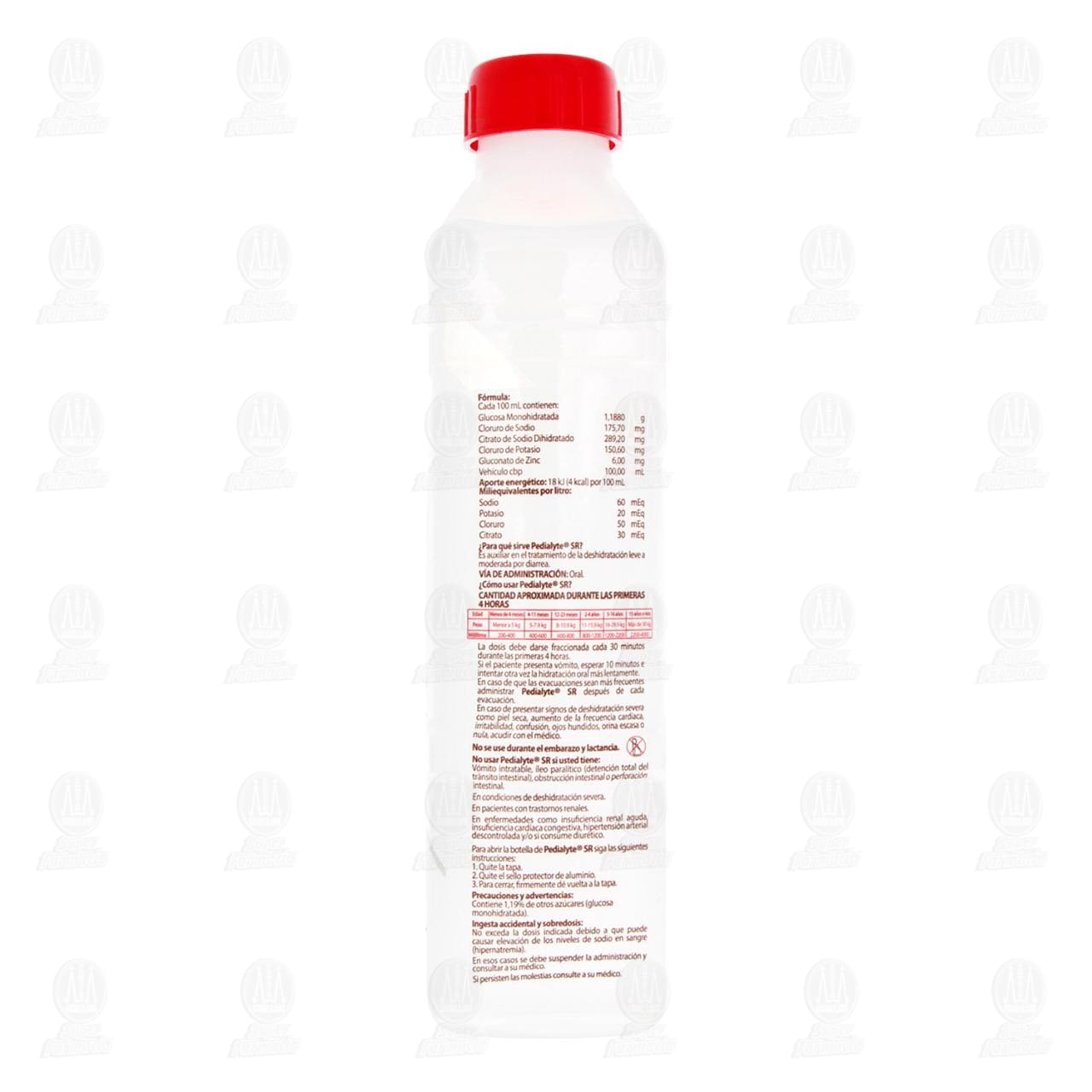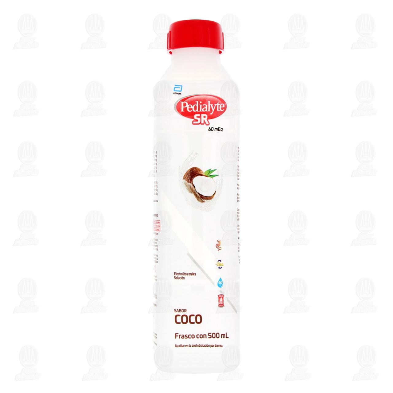 Electrolitos orales Pedialyte SR 60mEq para la prevención de la deshidratación provocada por diarrea, sabor coco. Envase con 500 mililitros.
