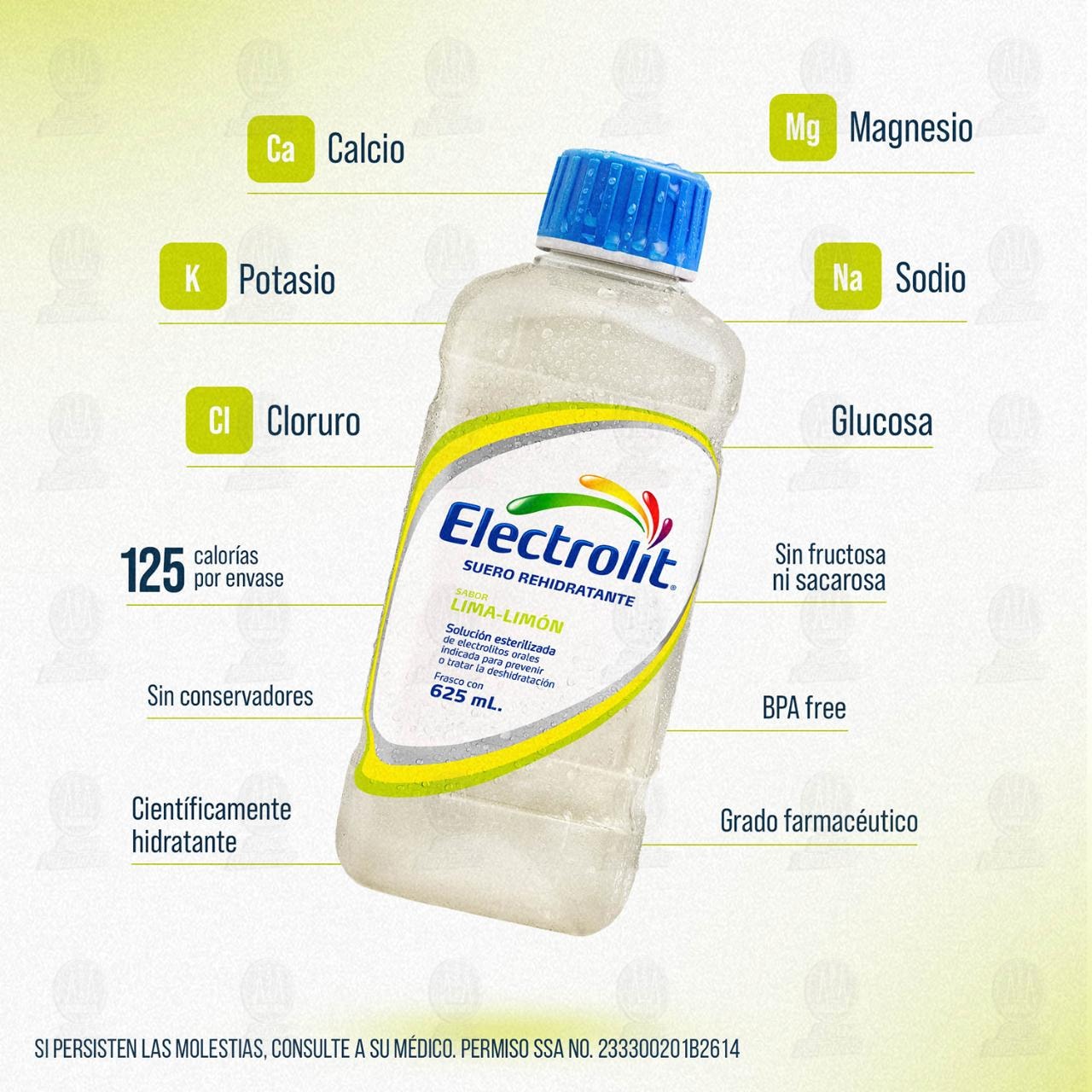 Suero Rehidratate Electrolit para prevenir o tratar la deshidratación ocasionada por el exceso de calor, desgaste físico intenso, insolación, resaca, vómito y/o diarrea, sabor lima-limón. Envase con 625 mililitros.