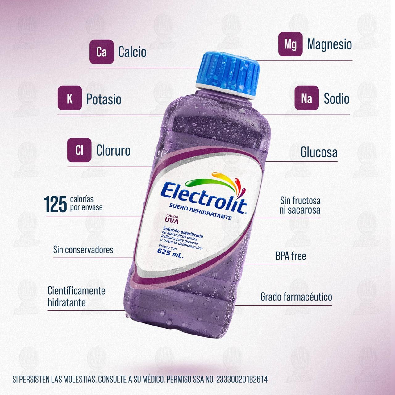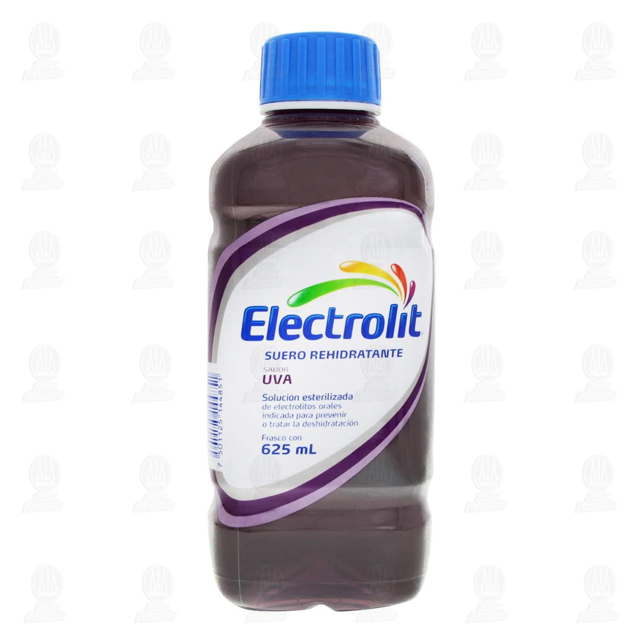 Suero Rehidratante Electrolit para prevenir o tratar la deshidratación ocasionada por el exceso de calor, desgaste físico intenso, insolación, resaca, vómito y/o diarrea, sabor uva. Envase con 625 mililitros.