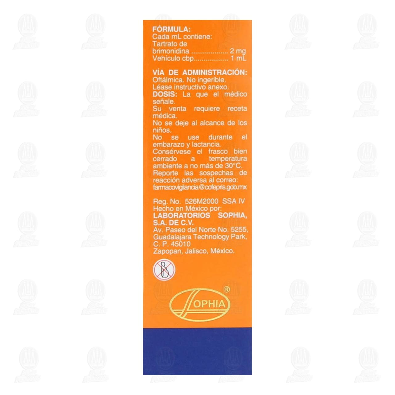 PRECAUCIONES EN RELACIÓN CON EFECTOS DE CARCINOGÉNESIS, MUTAGÉNESIS, TERATOGÉNESIS Y SOBRE LA FERTILIDAD: La brimonidina ha sido evaluada en algunos estudios de seguridad usando dosis mucho mayores que las que se usan en los humanos. Los estudios de toxicidad ocular y sistémica a 6 meses en conejos y a 1 año en monos con formulaciones a 0.2, 0.5 y 0.8% de formulaciones oftálmicas de brimonidina, arrojaron resultados negativos. La mayor concentración (0.8%) usada en conejos y monos resultó en concentraciones plasmáticas de la droga de 95 (Cmáx.) y 10 (C2 hr) veces respectivamente mayores a aquellas que se observan en los humanos luego de la administración tópica del fármaco. Se observó un efecto sedante incrementado dependiente de la dosis en el estudio a 1 año de administración oral de la droga en monos sin evidencia alguna de toxicidad orgánica, y la dosis que alcanzó aparentemente su efecto farmacológico produjo una concentración plasmática que fue de aproximadamente 115 veces mayor que la que se observa en humanos luego de la administración tópica. En estudios de carcinogenicidad a 2 años en ratones y ratas, usando dosis que produjeron concentraciones plasmáticas de 77 y 118 veces respectivamente mayores que aquellas observadas en humanos, no produjeron algún efecto oncogénico. Basados en la extensa investigación de seguridad a la que se sometió a la brimonidina se concluye que este fármaco posee un excelente perfil de seguridad.