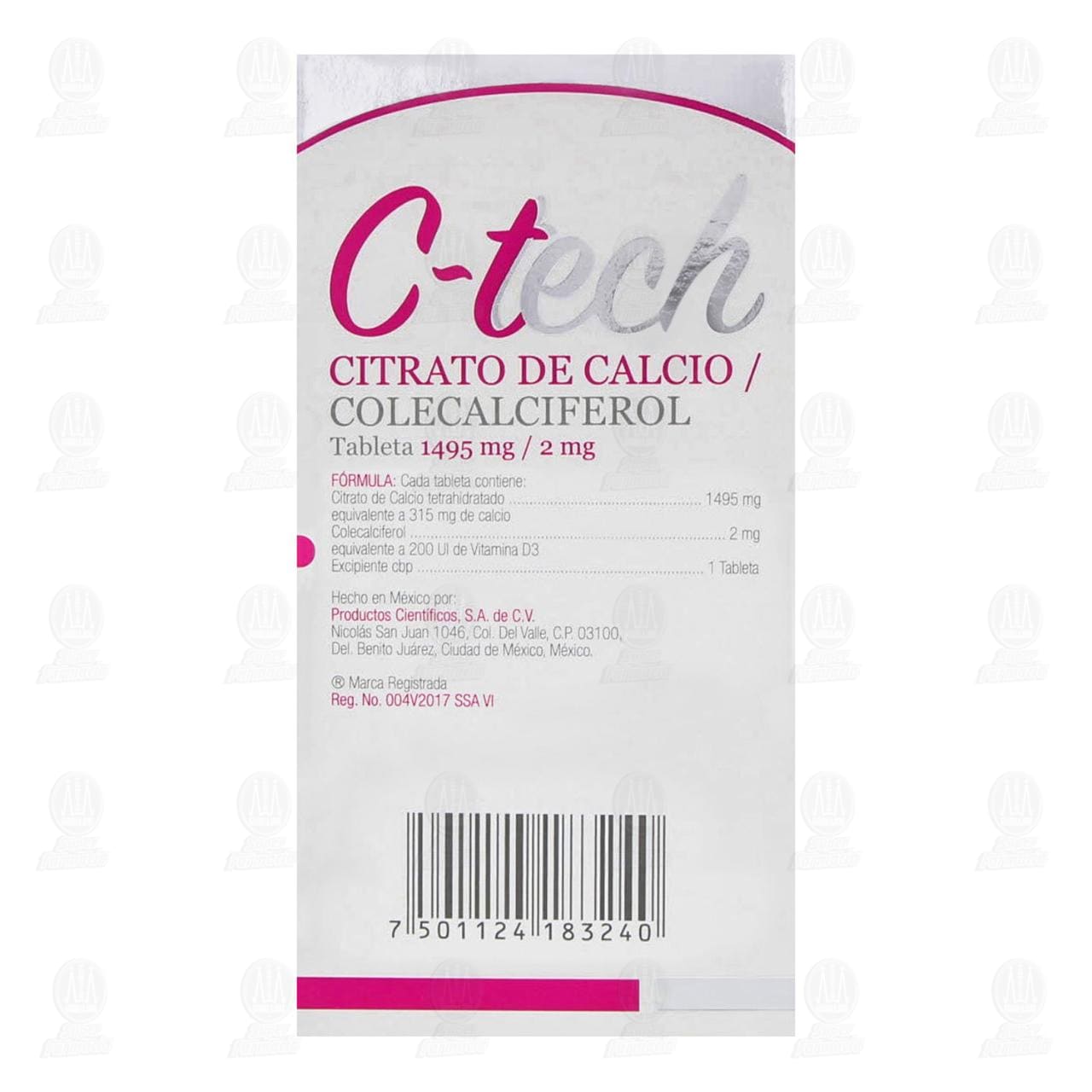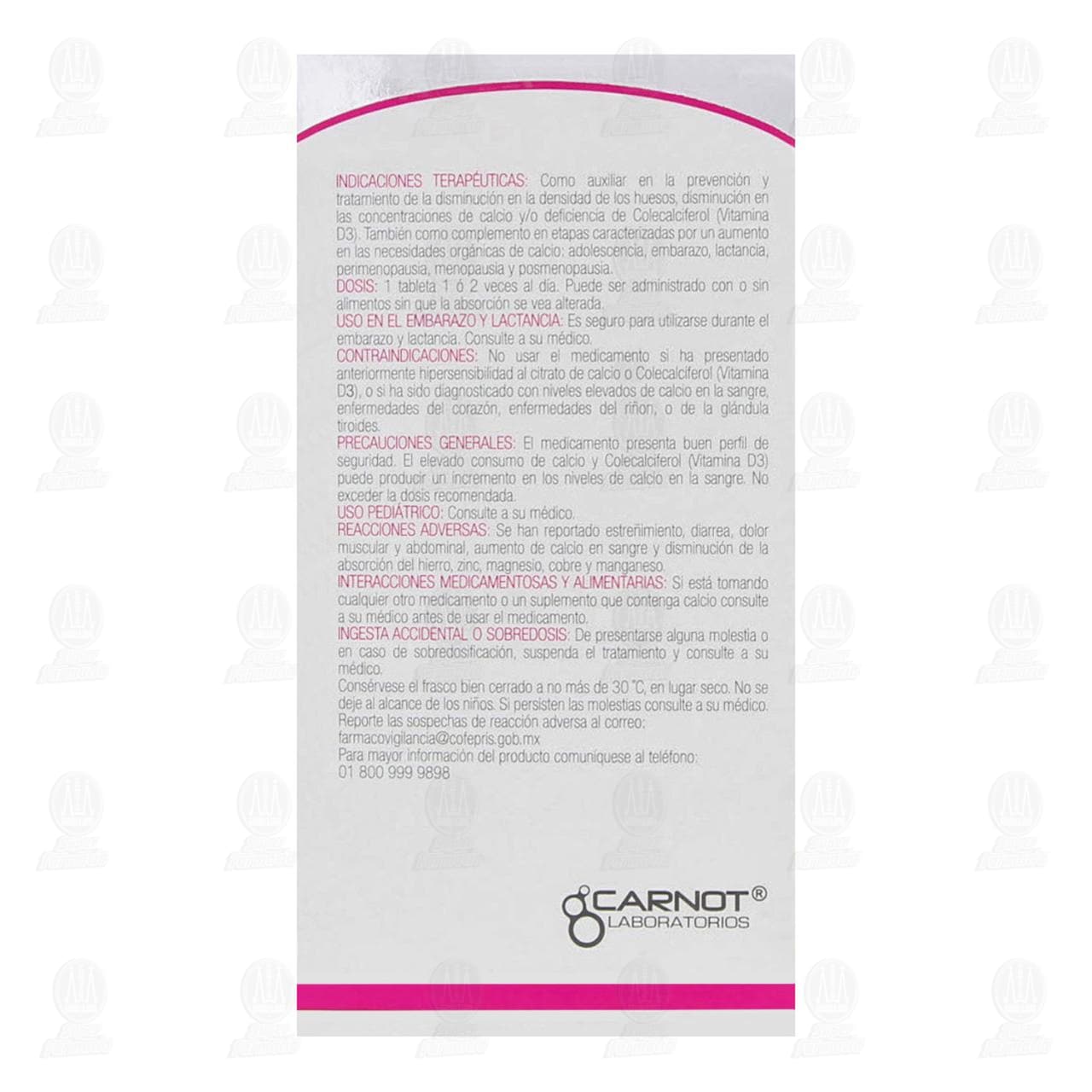 Contraindicaciones: No usar el medicamento si ha presentado anteriormente hipersensibilidad al citrato de calcio o colecalciferol (vitamina d3), o si ha sido diagnosticado con niveles elevados de calcio en la sangre, enfermedades del corazón, enfermedades del riñón, o de la glándula tiroides. Precauciones generales: el medicamento presenta buen perfil de seguridad. El elevado consumo de calcio y colecalciferol (vitamina d3) puede producir un incremento en los niveles de calcio de la sangre. No exceder la dosis recomendada. Reacciones adversas: se ha reportado estreñimiento, diarrea, dolor muscular y abdominal, aumento de calcio en sangre y disminución de la absorción del hierro, zinc, magnesio, cobre y manganeso. Ingesta accidental o sobredosis: de presentarse alguna molestia o en caso de sobredosificación, suspenda el tratamiento y consulte a su médico. Consérvese el frasco bien cerrado a no más de 30°C, en lugar seco. No se deje al alcance de los niños. Si persisten las molestias consulte a su médico. Reporte las sospechas de reacción adversa al correo: farmacovigilancia@cofepris.gob.mx.Detalles del producto
