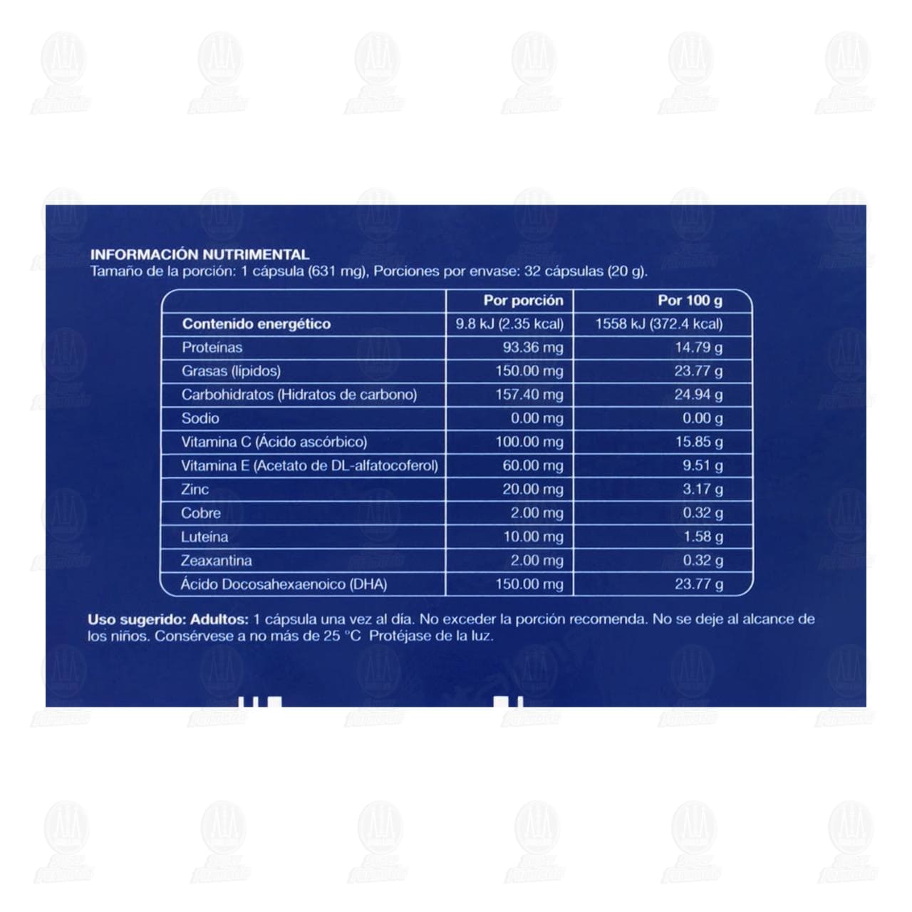 Porciones por envase: 32 cápsulas (20 g) o 48 cápsulas (30 g).