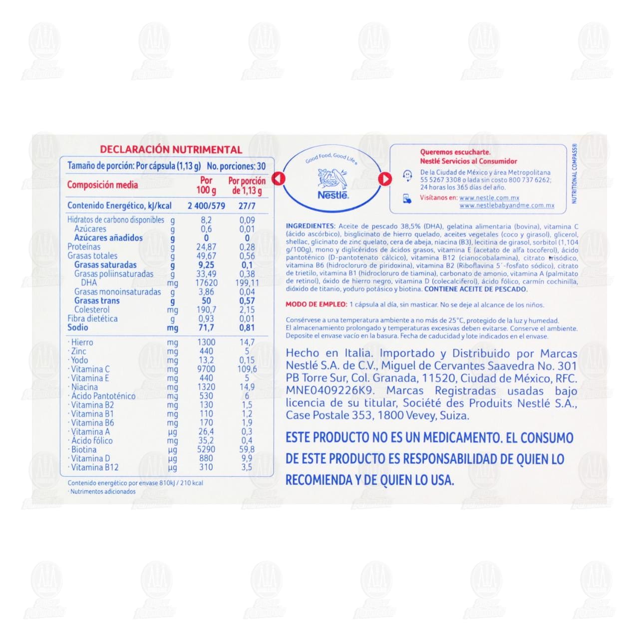 Consérvese a una temperatura ambiente a no más de 25°C, protegido de la luz y humedad. El almacenamiento prolongado y temperaturas excesivas deben evitarse. Si este producto cambia de color, olor o apariencia debe desecharse. No se deje al alcance de los niños. Este producto no es un medicamento. El consumo de este producto es responsabilidad de quien lo recomienda y de quien lo usa. No exceda la dosis recomendada, los suplementos alimenticios no están pensados como un sustituto de una dieta variada y equilibrada y un estilo de vida saludable. Contiene ácido fólico, vitaminas del complejo B, yodo, vitamina D y DHA.Detalles del producto
