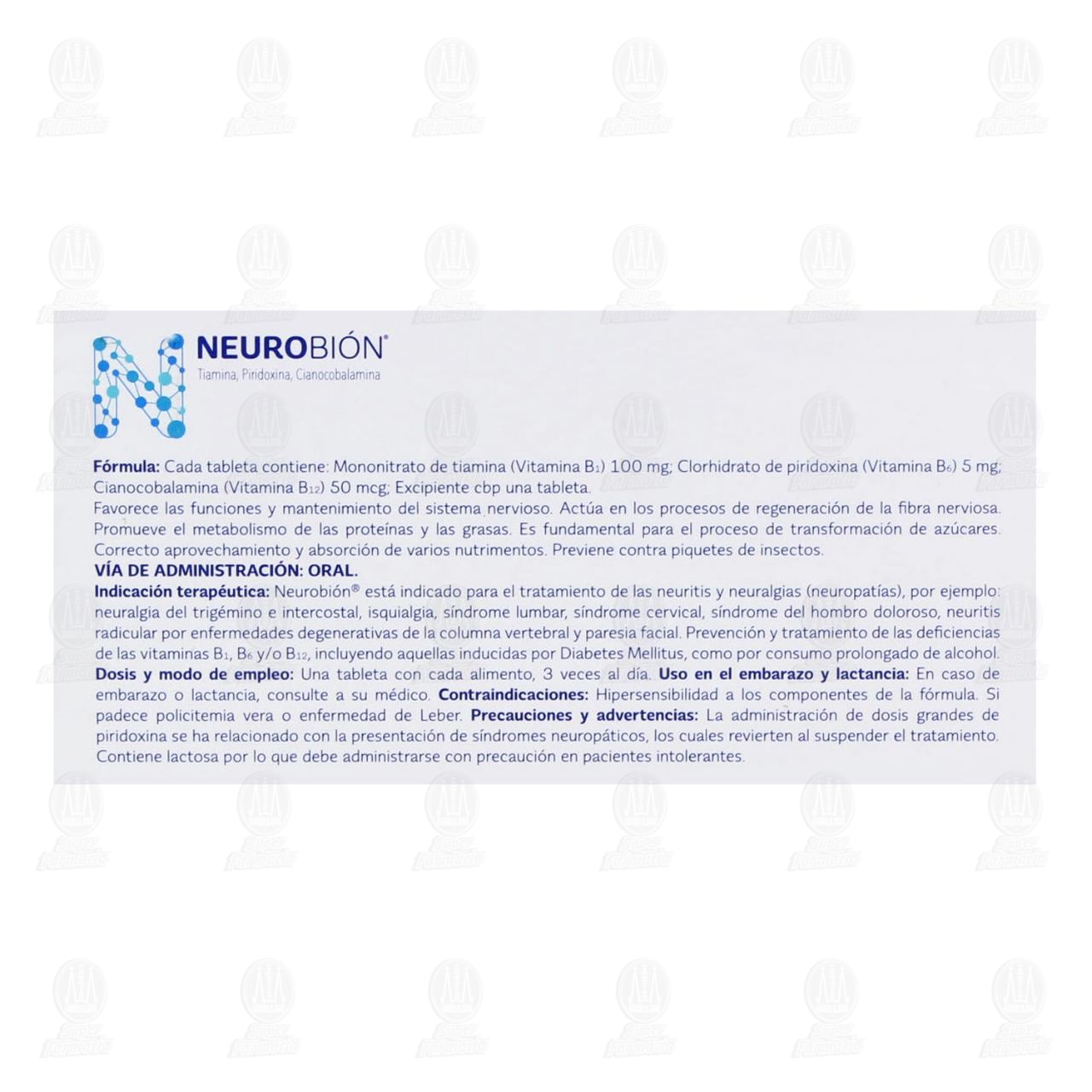 Indicaciones terapéuticas: Neurobión está indicado para el tratamiento de las neuralgias (neuropatías), por ejemplo: neuralgia del trigémino e intercostal, isquialgia, síndrome lumbar, síndrome cervical, síndrome del hombro doloroso, neuritis radicular por enfermedades degenerativas de la columna vertebral y paresia facial. Prevención y tratamiento de las deficiencias de las vitaminas B1, B6 y/o B12, incluyendo aquellas inducidas por Diabetes Mellitus, como por consumo prolongado de alcohol. Uso en el embarazo y lactancia: En caso de embarazo o lactancia, consulte a su médico. Contraindicaciones: Hipersensibilidad a los componentes de la fórmula. Si padece policitemia vera o enfermedad de Leber. Precauciones y advertencias: La administración de dosis grandes de piridoxina se ha relacionado con la presentación de síndrome neuropáticos, los cuales revierten al suspender el tratamiento. Contiene lactosa por lo que debe administrarse con precaución en pacientes intolerantes.Detalles del producto