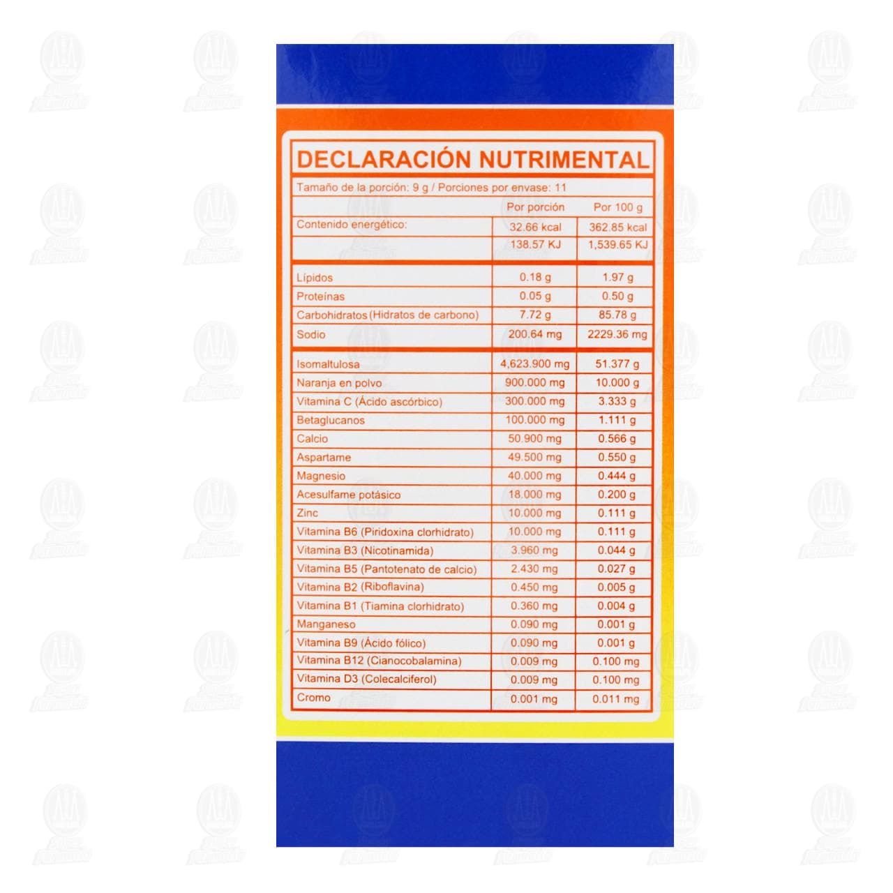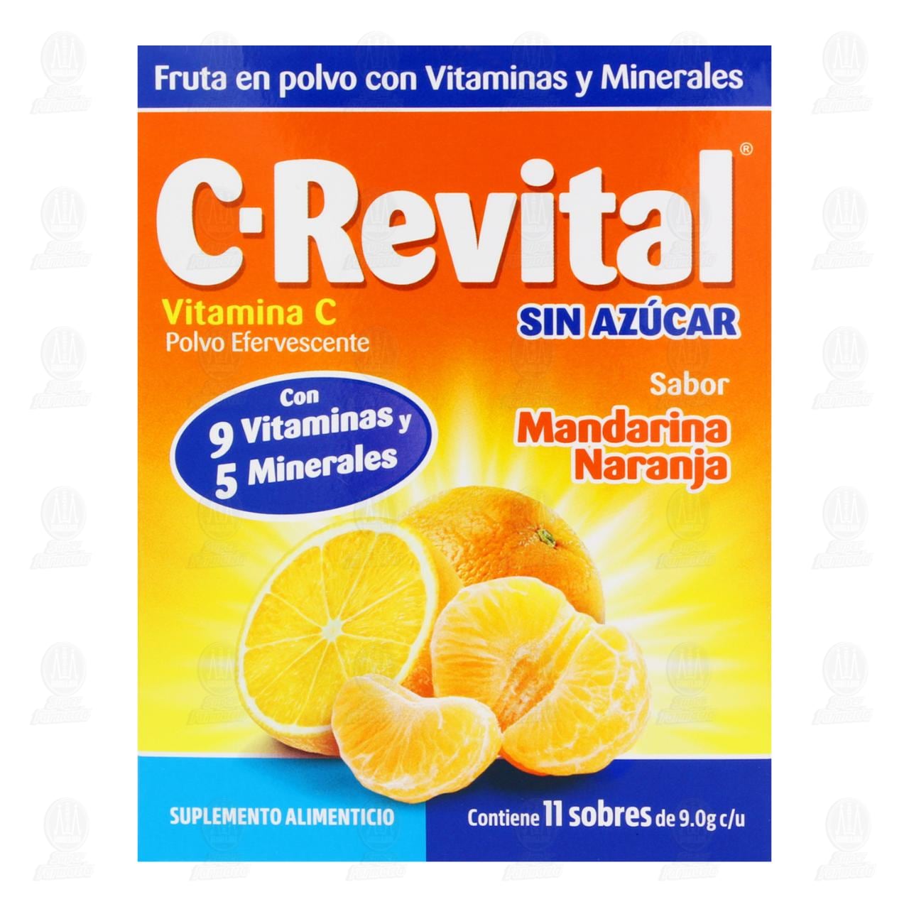 Suplemento alimenticio C-Revital en Polvo Efervescente Sabor Mandarina Naranja con 9 vitaminas (vitamina C) y 5 minerales, Sin Azúcar. Caja con 11 sobres de 9 gramos cada uno.