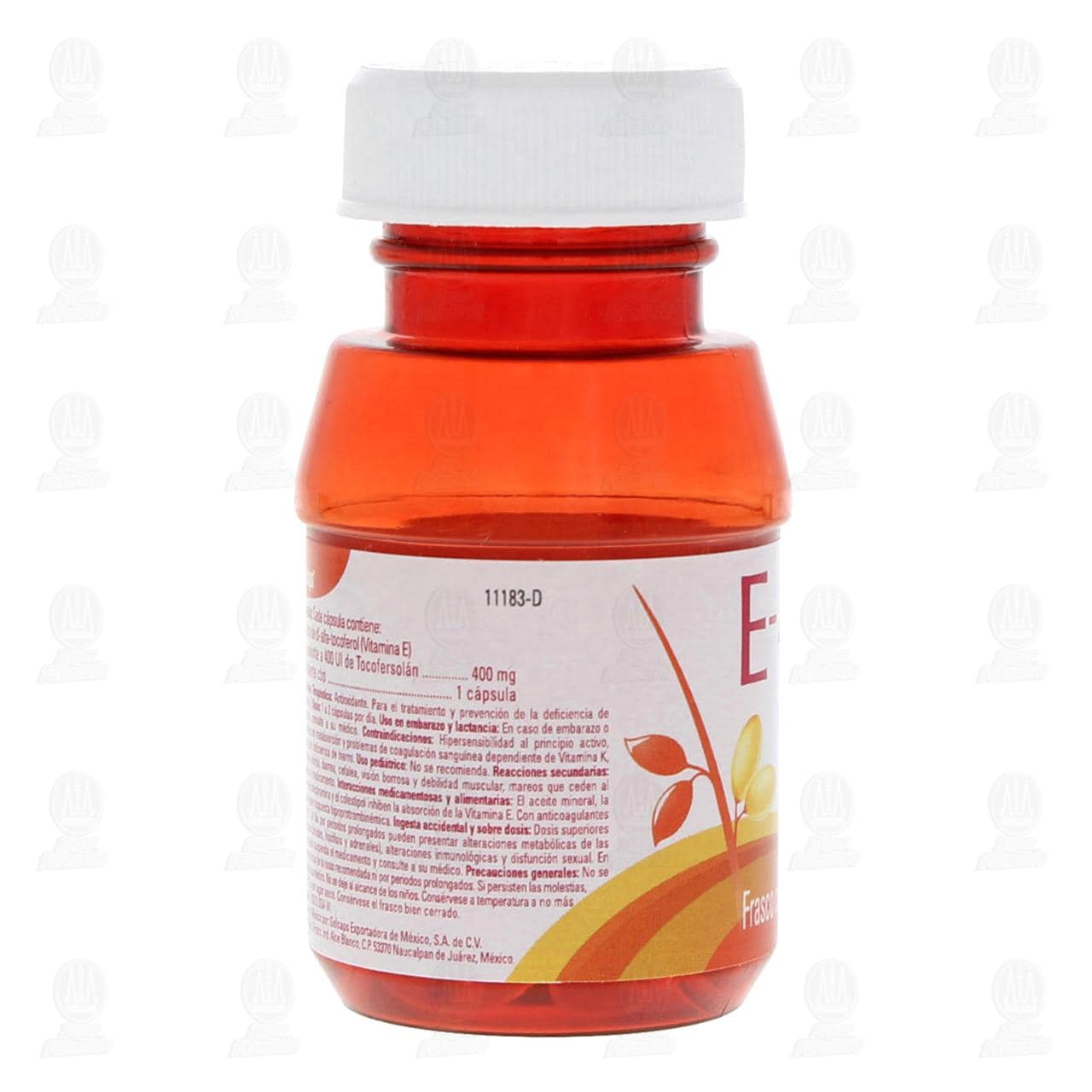 Uso en el embarazo y lactancia: En caso de embarazo o lactancia consulte a su médico. Contraindicaciones: Hipersensibilidad al principio activo, pacientes con malabsorción y problemas de coagulación sanguínea dependiente de vitamina k, anemia por deficiencia de hierro. Uso pediátrico: No se recomienda. Reacciones secundarias: Náuseas, vómito, diarrea, cefalea, visión borrosa y debilidad muscular, mareos que ceden al suprimir el medicamento. Interacciones medicamentosas y alimentarias: El aceite mineral, la resina de colestiramina y el colestipol inhibe la absorción y la vitamina e. Con anticoagulantes puede haber respuesta hipoprotrombinémica. Ingesta accidental y sobredosis: Dosis superiores a 800 UI al día por periodos prolongados pueden presentar alteraciones metabólicas y disfunción sexual. En estos casos suspenda el medicamento y consulte a su médico. Precauciones generales: No se administre más de la dosis recomendada ni por periodos prolongados. Si persiste las molestias consulte a su médico. Consérvese a temperatura a no más de 30°C y en lugar seco. Consérvese el frasco bien cerrado.Detalles del producto