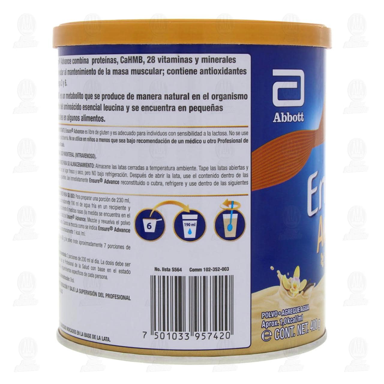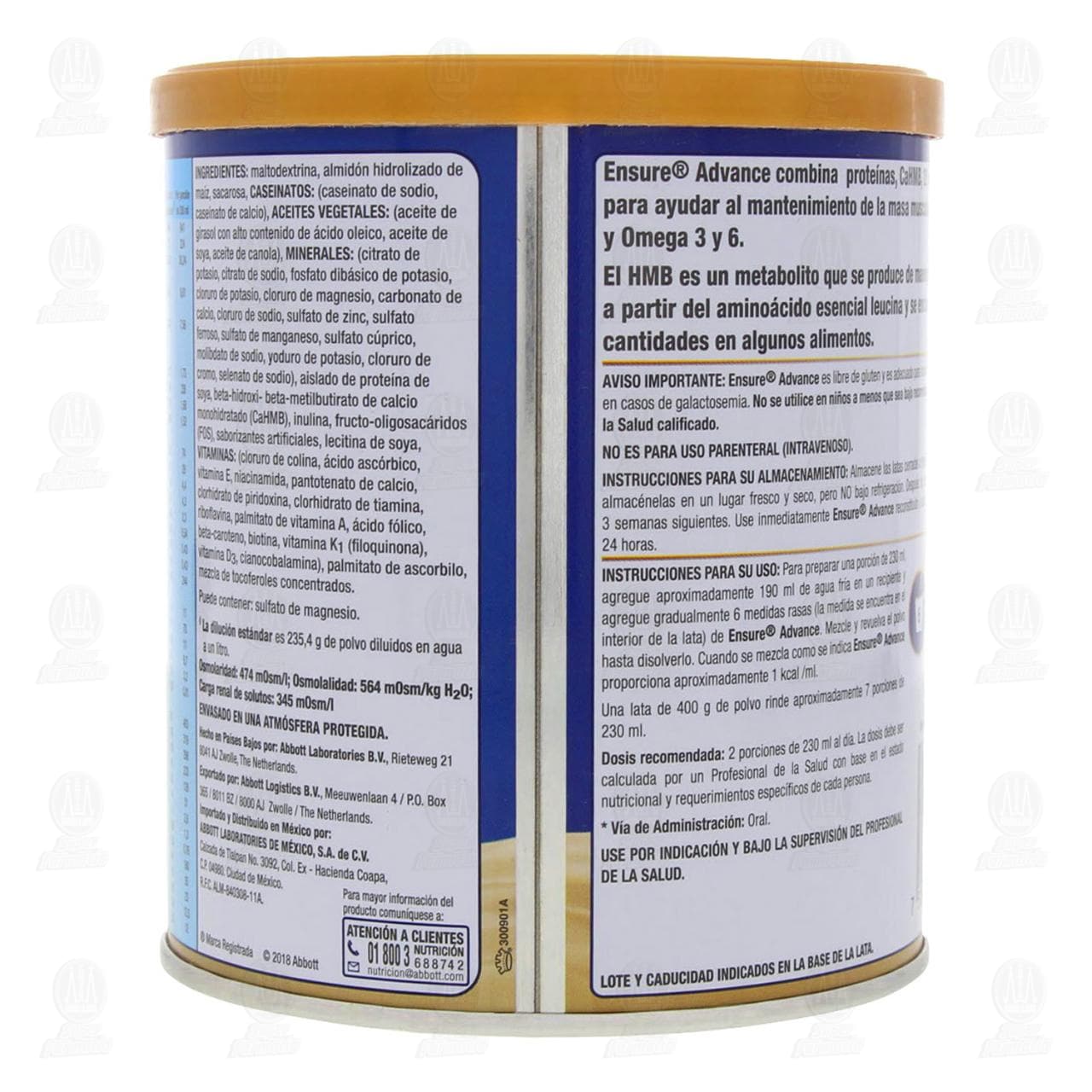 Puede contener sulfato de magnesio. No se use en casos de galactosemia. No se utilice en niños a menos que sea bajo recomendación de un médico u otro profesional de la salud calificado. No es para uso parenteral (intravenoso). Almacenamiento: almacene las latas cerradas a temperatura ambiente. Tape las latas abiertas y almacénelas en un lugar fresco y seco, pero no bajo refrigeración. Después de abrir la lata, use el contenido dentro de las 3 semanas siguientes. Use inmediatamente Ensure Advance reconstituido o cubra, refrigere y use dentro de las siguientes 24 horas. Use por indicación y bajo la supervisión del profesional de la salud.Detalles del producto