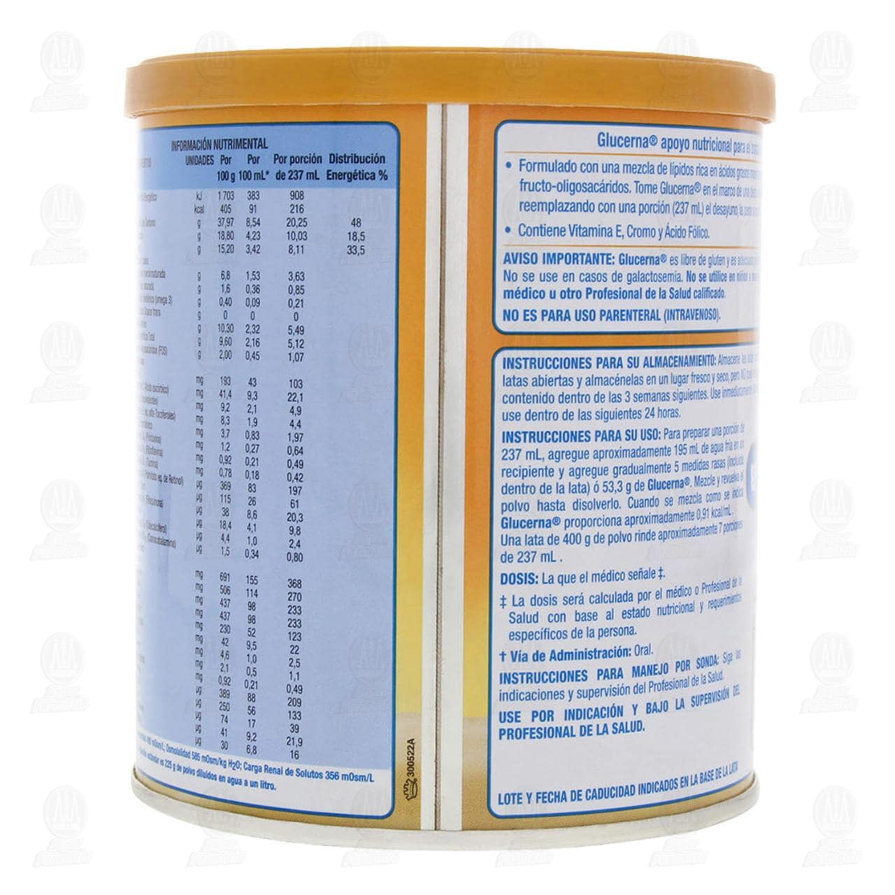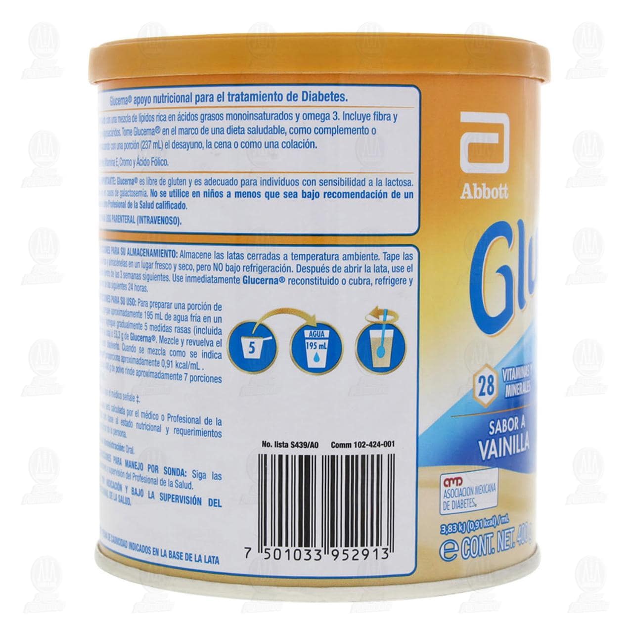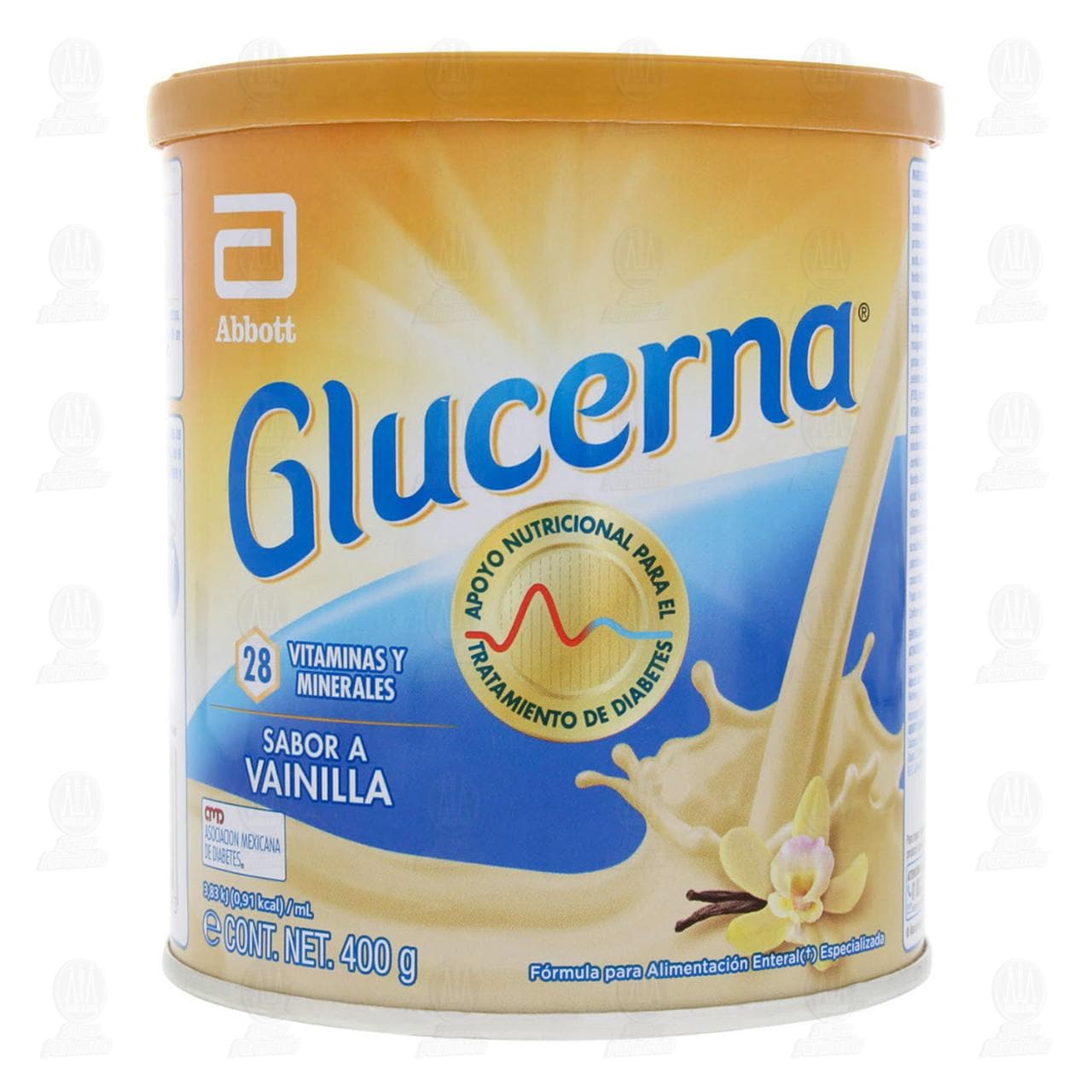 Fórmula especializada Glucerna en polvo para alimentación enteral, con una mezcla de lípidos rica en ácidos grasos monoinsaturados y omega 3, sabor a vainilla. Lata con 400 gramos.