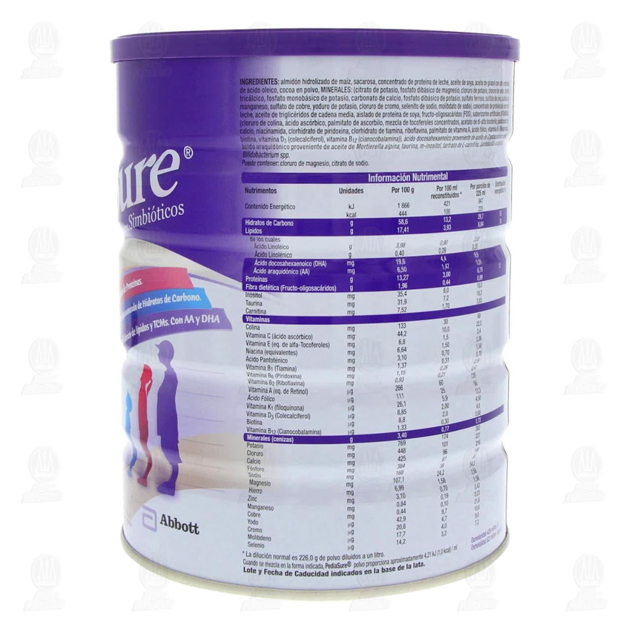 Use por indicación y bajo la supervisión del profesional de la salud. No usar por vía parenteral. No recomendado en niños con galactosemia. Almacene las latas en un lugar fresco y seco a temperatura ambiente (no en refrigeración). Las latas abiertas deben taparse y su contenido debe usarse dentro de las tres semanas siguientes. Una vez reconstituido, Pediasure se debe usar en corto tiempo, o cubrir, refrigerar y usar dentro de las 24 horas siguientes. Nunca utilice el horno de microondas para calentar el producto. Puede ocasionar quemaduras serias. Preparar el producto con agua a temperatura mayor a 35°C puede reducir los beneficios de los probióticos. Use antes de la fecha de caducidad indicada en la base de la lata.Detalles del producto