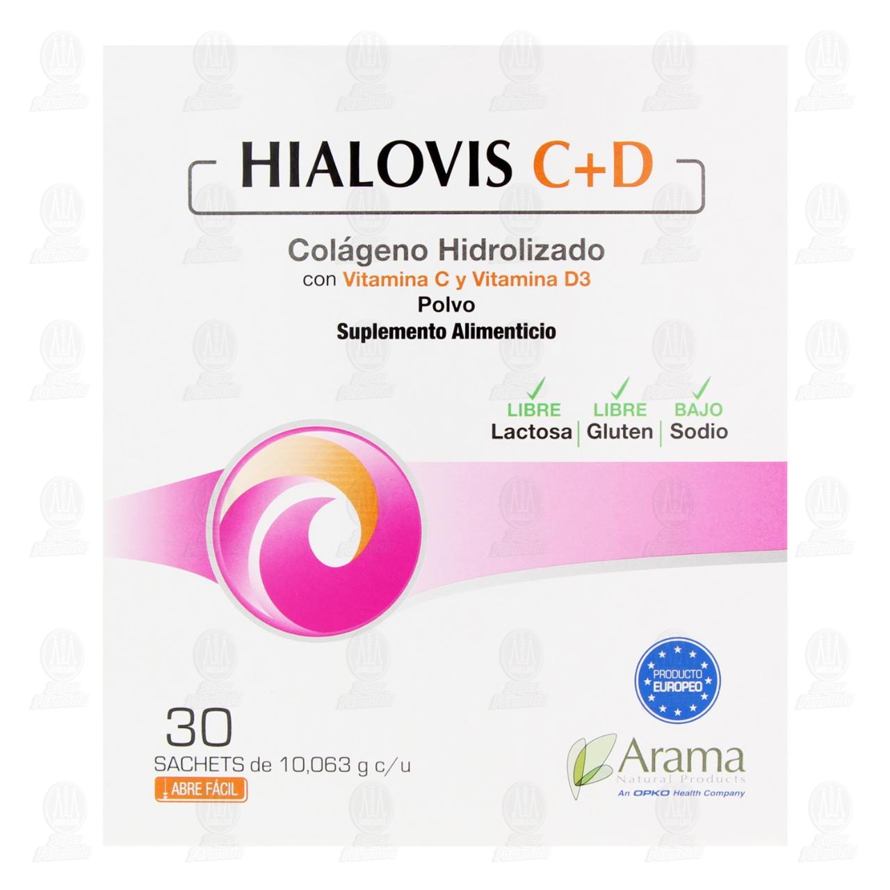 Suplemento alimenticio Hialovis C+D en polvo a base de colágeno hidrolizado con vitamina C y vitamina D3. Caja con 30 sobres (cada uno de 10.063 gramos).